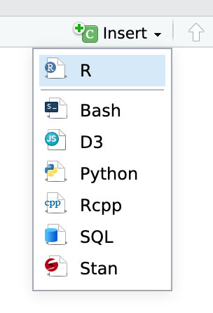 You’ll need to insert some of your own code chunks. Rather than typing them by hand (that’s tedious!), use the “Insert” button at the top of the editing window, or press ⌥ + ⌘ + I on macOS, or ctrl + alt + I on Windows.