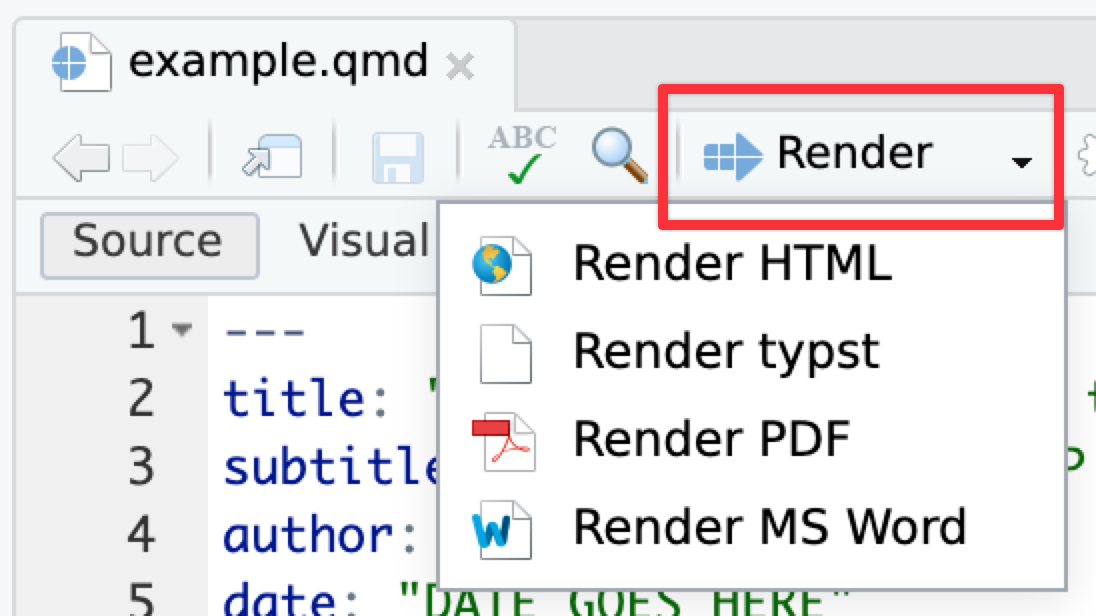 When you’re all done, click on the “Render” button at the top of the editing window and create a Typst (pdf), PDF, or Word version of your document. Upload that file to iCollege. Do not upload a rendered HTML file (they don’t work on iCollege).