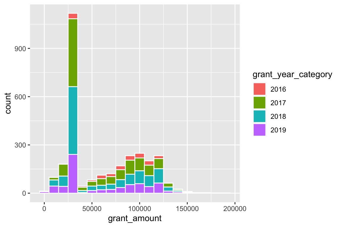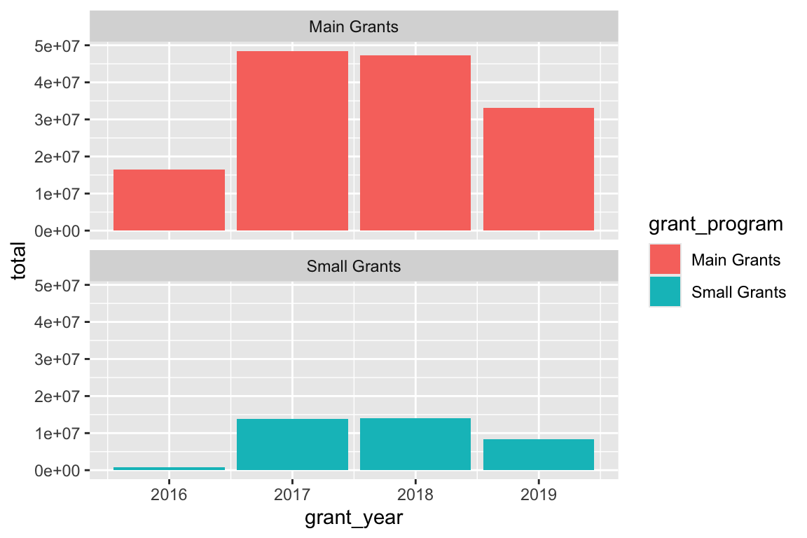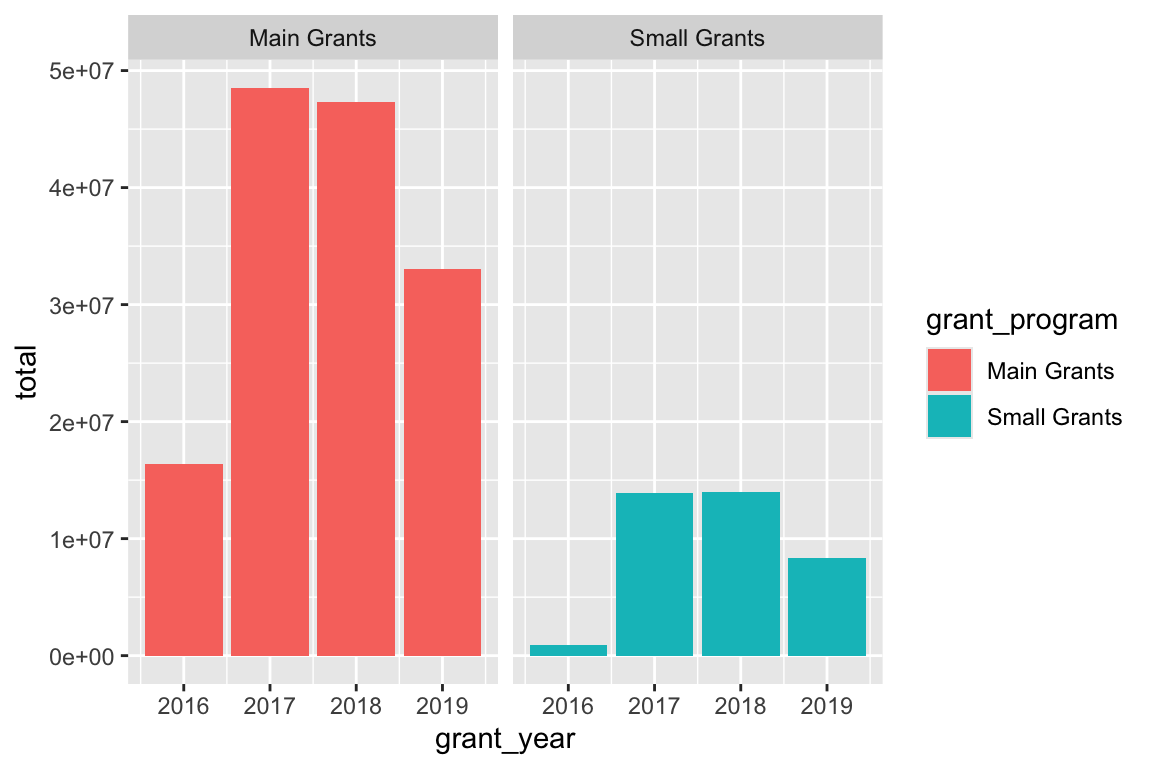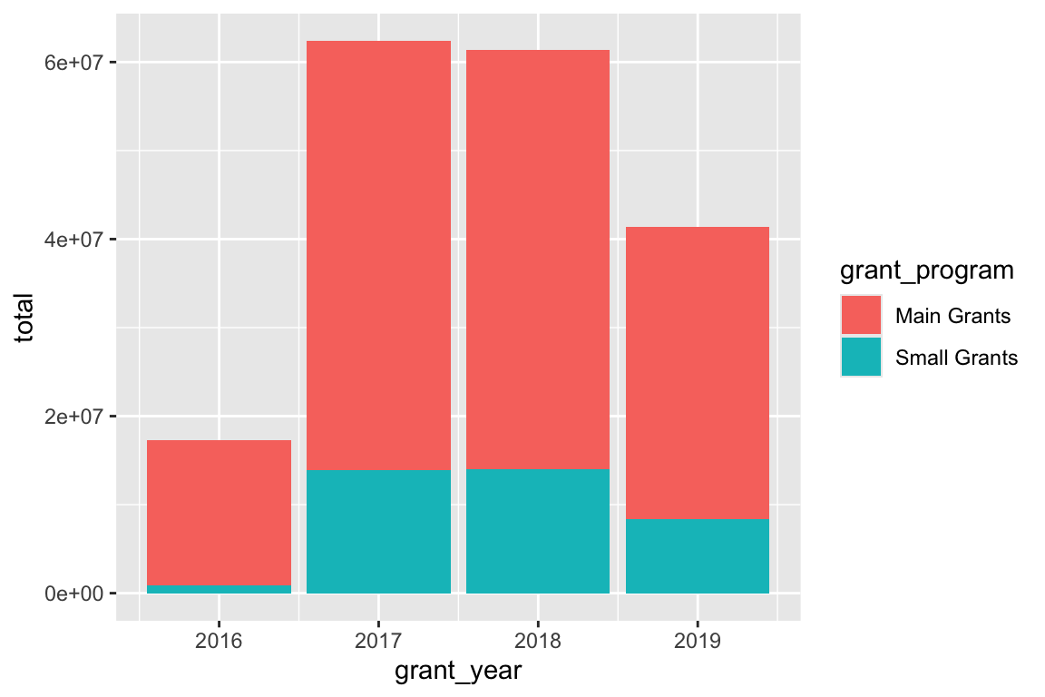 ## 8 2019 Small Grants 8369324 25058. 334Next we’ll plot the data, mapping the grant_program column to the fill aesthetic: