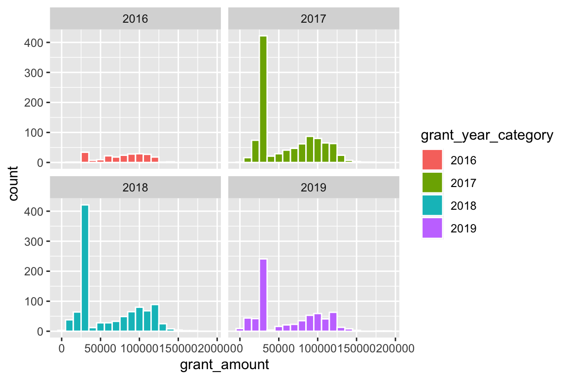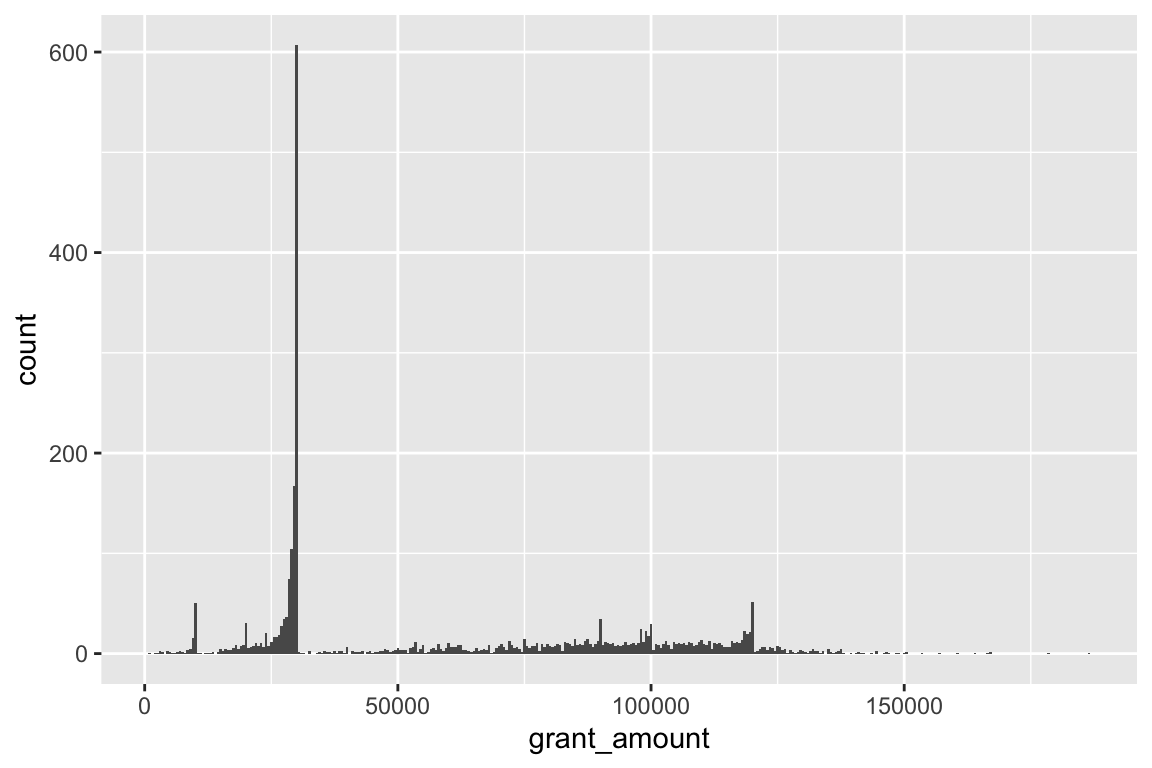 mutate(grant_year_category = factor(grant_year))First let’s look at the distribution of grant amounts with a histogram. Map grant_amount to the x-axis and don’t map anything to the y-axis, since geom_histogram() will calculate the y-axis values for us:
