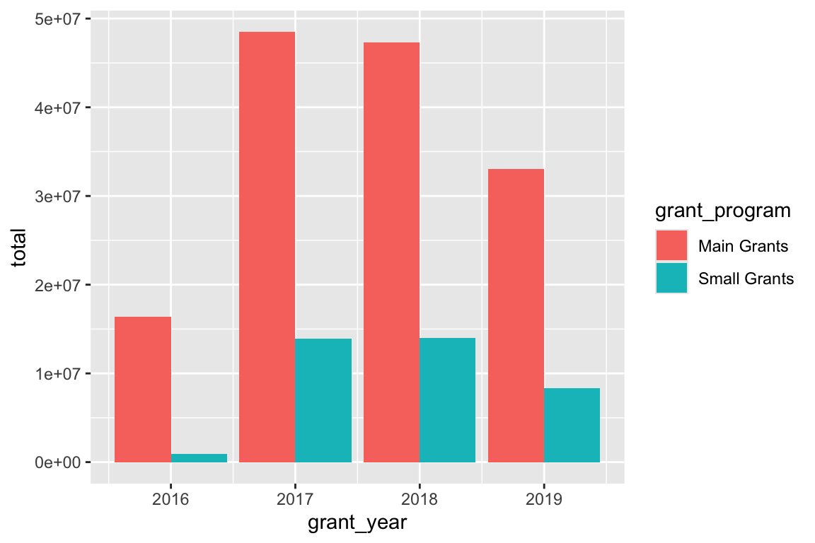 By default, ggplot will stack the different fill colors within the same bar, but this makes it a little hard to make comparisons. While we can see that the average small grant amount was a little bigger in 2017 than in 2019, it's harder to compare average main grant amount, since the bottoms of those sections don't align.