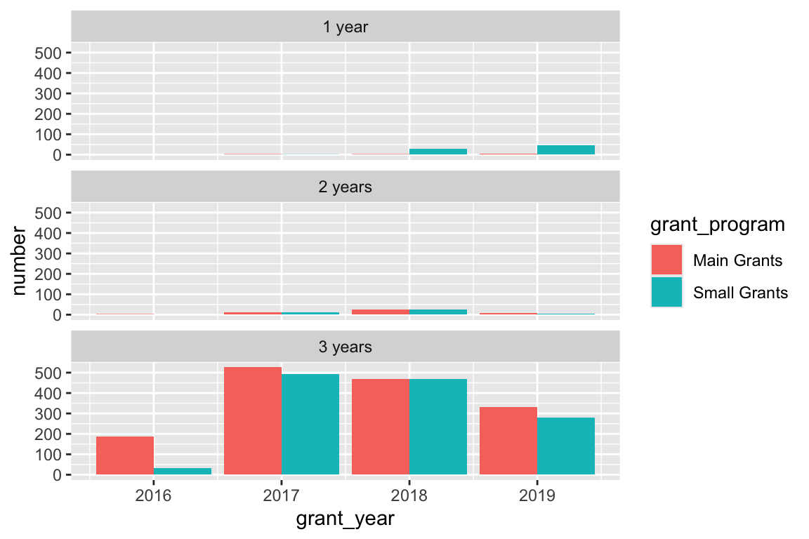 ggplot(bbc_year_size_duration, aes(x = grant_year, y = number, fill = grant_program)) +