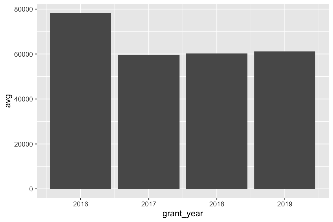 ## 4 2019 41388816 61136. 677Because we used summarize(), R shrank our data down significantly. We now only have a row for each of the subgroups we made: one for each year. We can plot this smaller data. We’ll use geom_col() for now (but in the next session you’ll learn why this is actually bad for averages!)