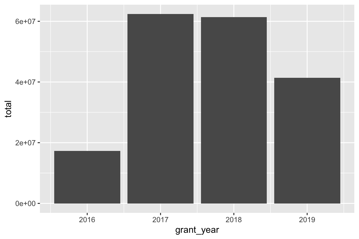 summarize(total = sum(grant_amount), # Find the total awarded in each group