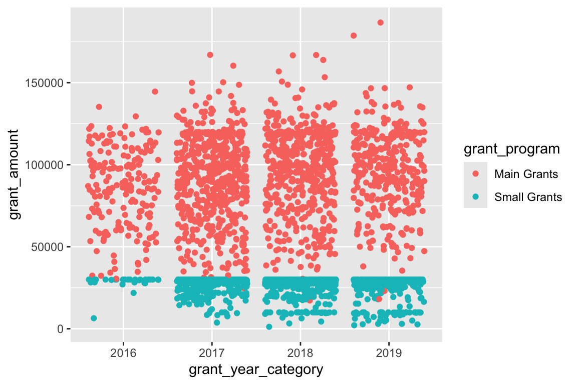 There are some weird clusters around £30,000 and below. Let’s map grant_program to the color aesthetic, which has two categories—regular grants and small grants—and see if that helps explain why: