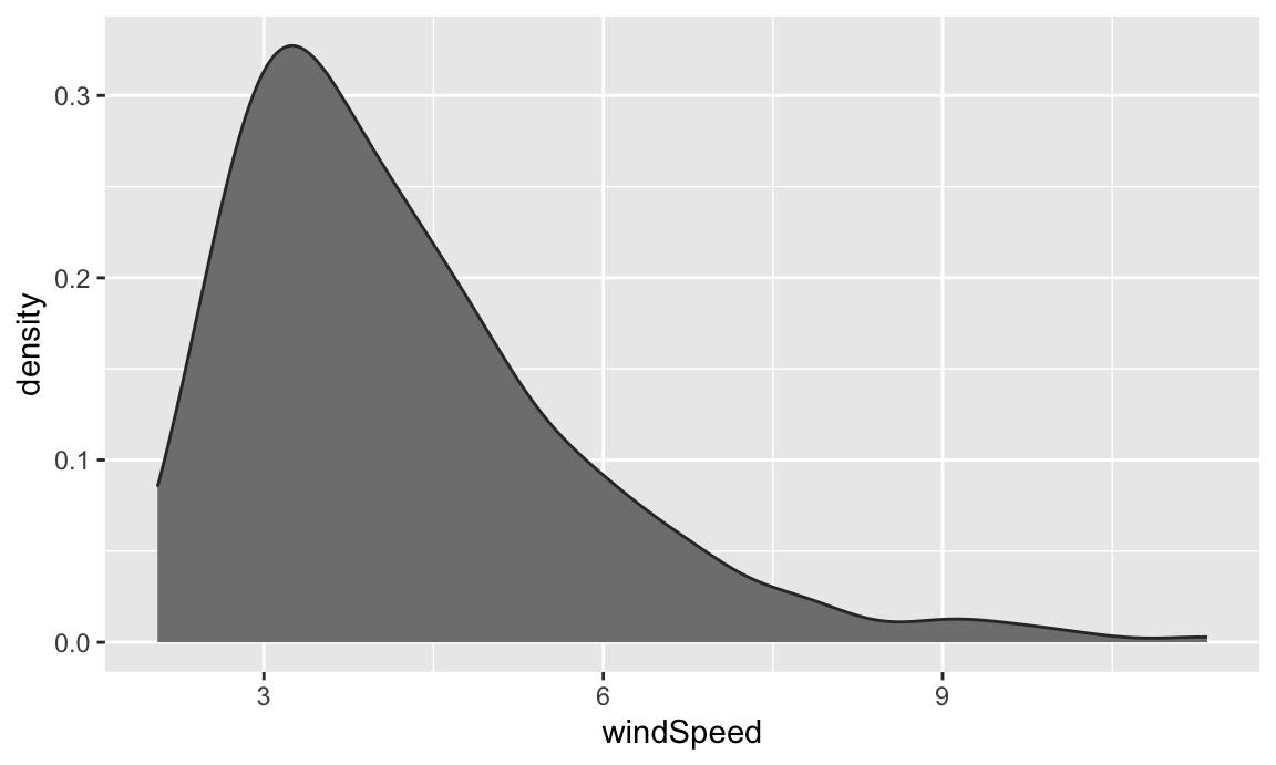 The code to create a density plot is nearly identical to what we used for the histogram—the only thing we change is the geom layer: