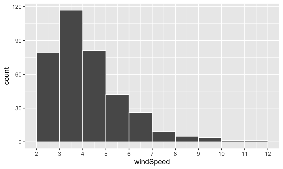 We can first make a histogram of wind speed. We’ll use a bin width of 1 and color the edges of the bars white: