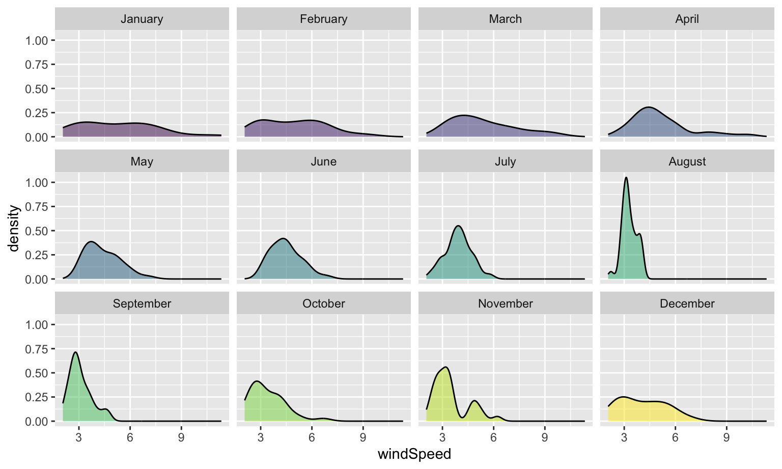 Neat! January, March, and April appear to have the most variation in windy days, with a few wind-less days and a few very-windy days, while August was very wind-less.