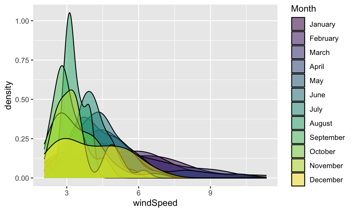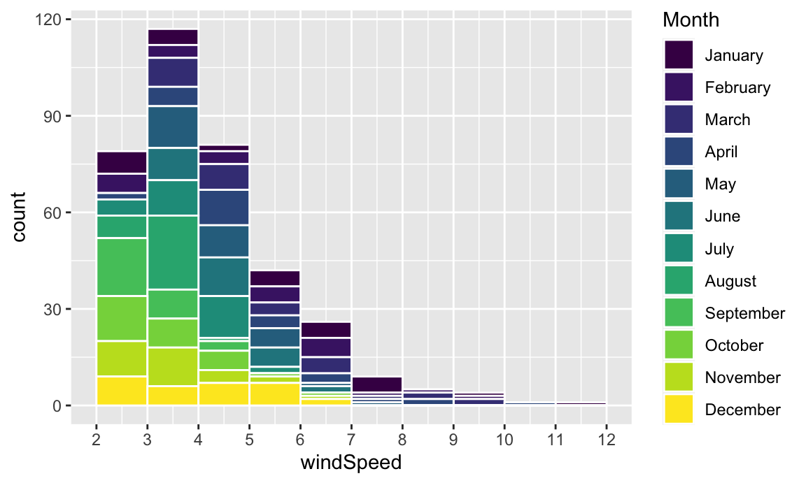 We can show the distribution of wind speed by month if we map the Month column we made onto the fill aesthetic: