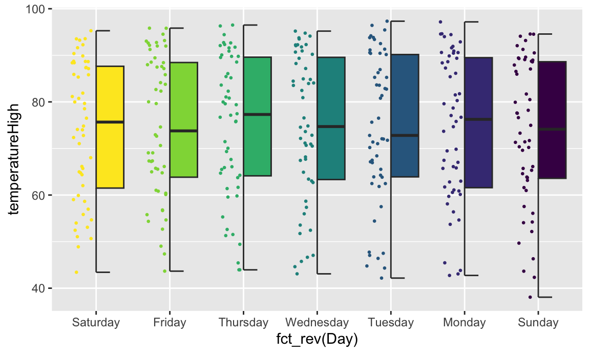 aes(x = fct_rev(Day), y = temperatureHigh)) +