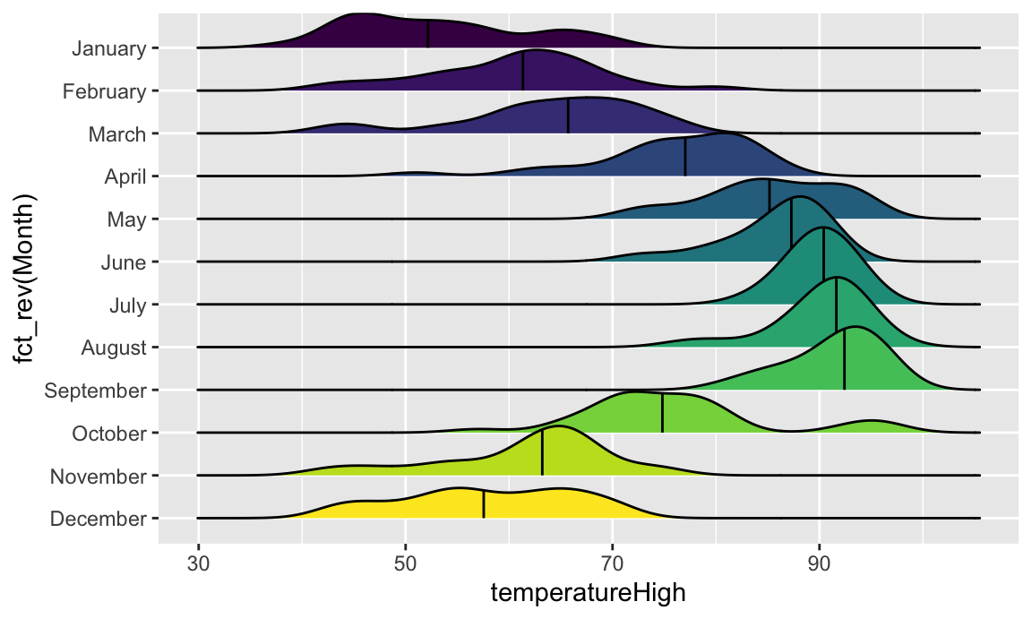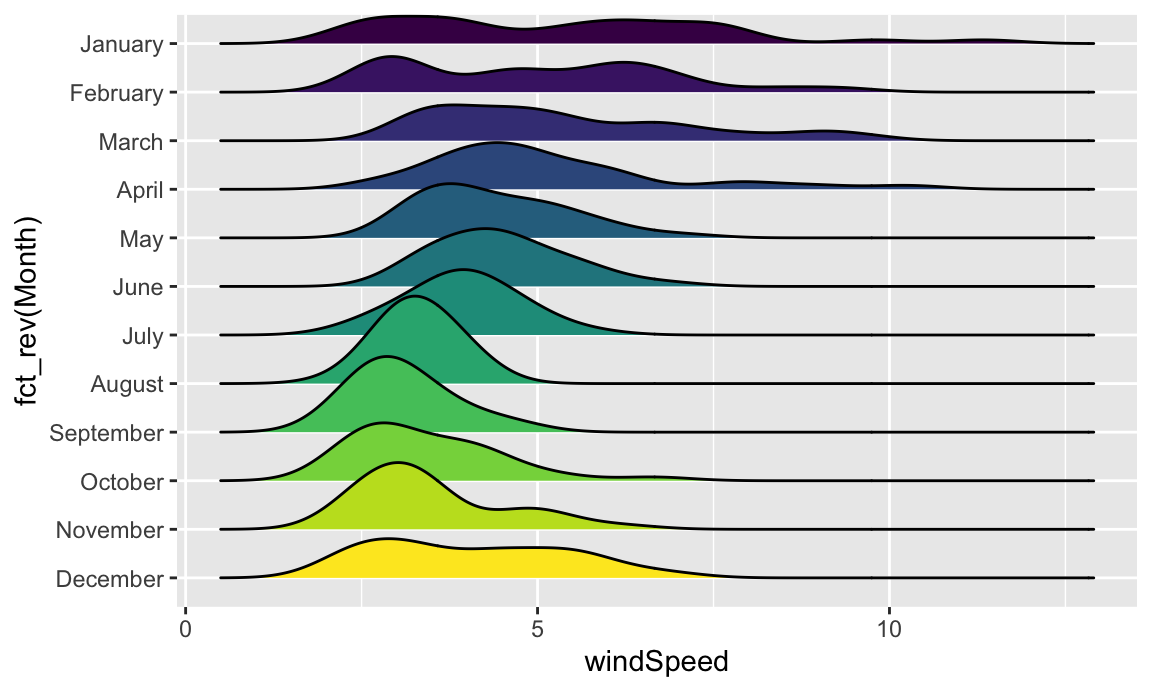 Or we can stack the density plots behind each other with {ggridges}. For that to work, we also need to map Month to the y-axis. We can reverse the y-axis so that January is at the top if we use the fct_rev() function: