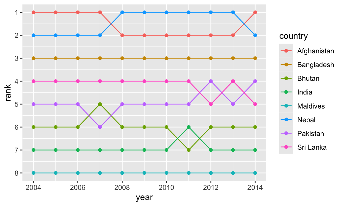 Finally, we can make a bump chart that shows changes in rankings over time. We'll look at CO<sub>2</sub> emissions in South Asia. First we need to calculate a new variable that shows the rank of each country within each year. We can do this if we group by year and then use the `rank()` function to rank countries by the `co2_emissions` column.