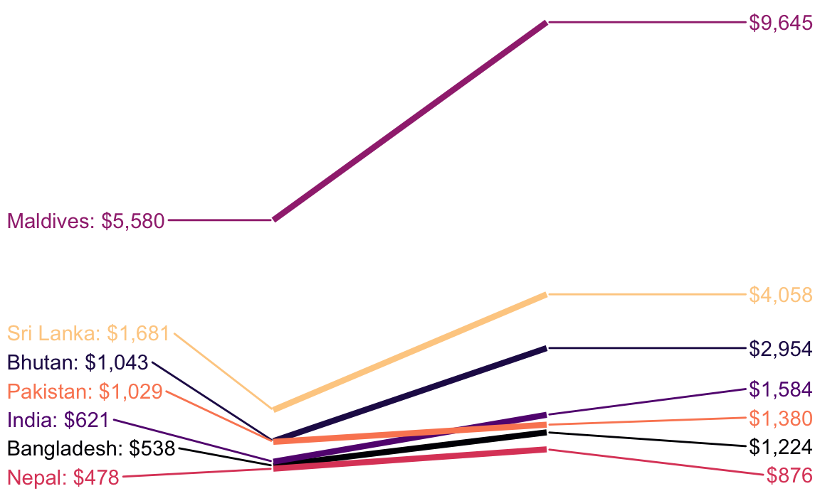ggplot(gdp_south_asia, aes(x = year, y = gdp_per_cap, group = country, color = country)) +