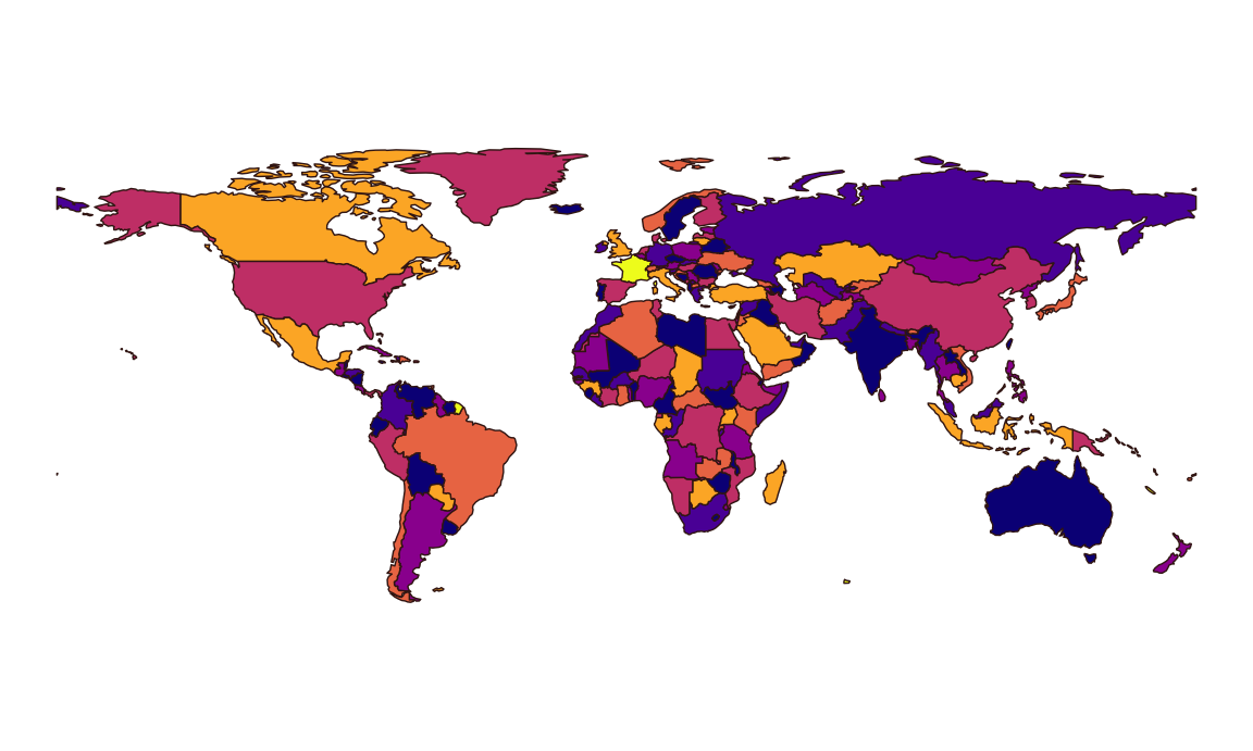 Sharp-eyed readers will notice that France and Norway are grayed out because they're missing data. That's because the `ISO_A3` code in the Natural Earth data is missing for both France and Norway for whatever reason, so the WDI data didn't merge with those rows. To fix that, we can do some manual recoding before joining in the WDI data.