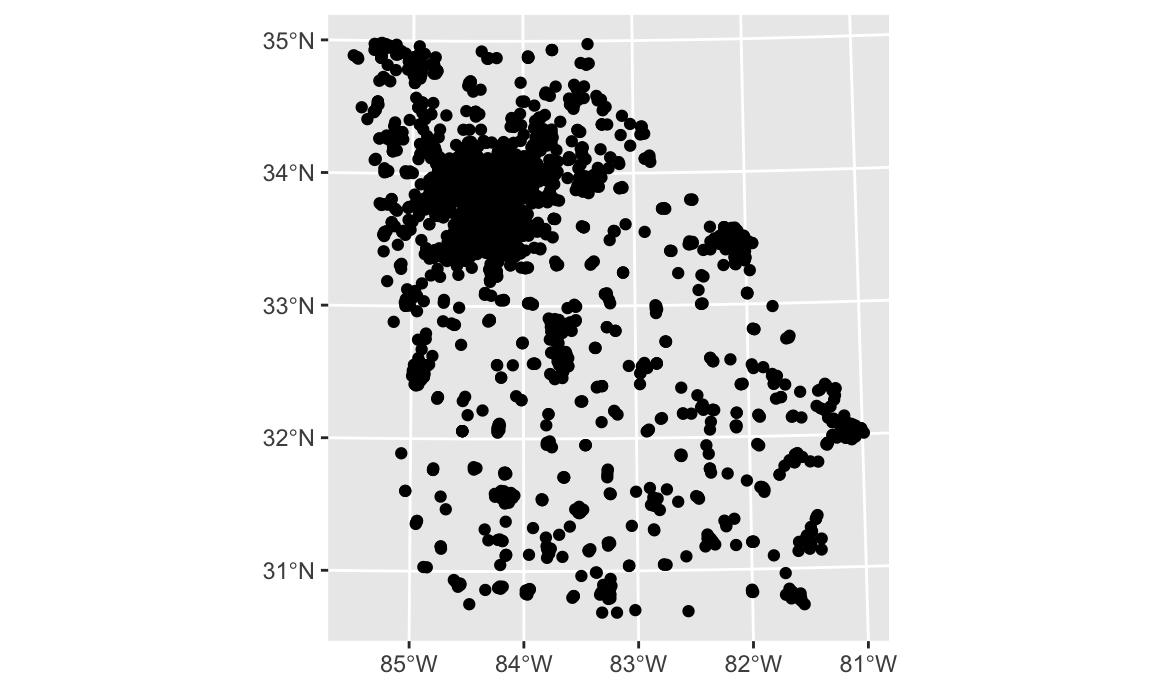 If we add a `geom_sf()` layer just for `ga_schools`, it'll plot a bunch of points: