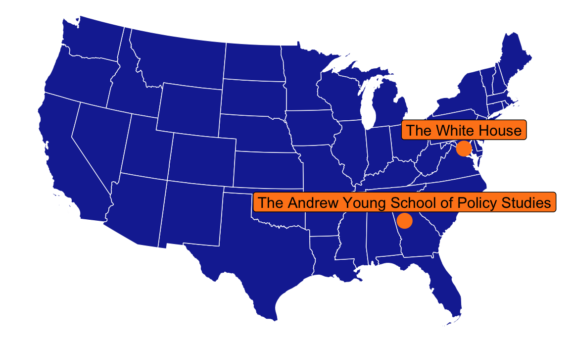 Let's say we want to mark some cities on our map of Georgia. We can make a mini dataset using `tribble()`. I found these points from Google Maps: right click anywhere in Google Maps, select "What's here?", and you'll see the exact coordinates for that spot.