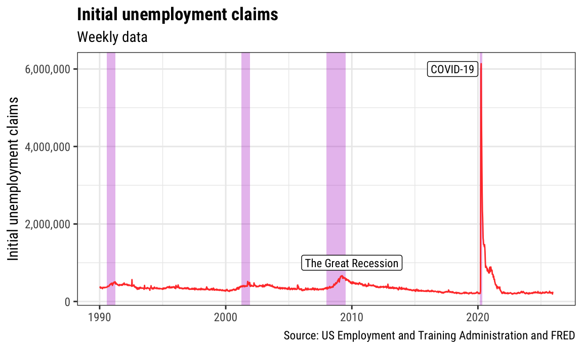 Now that we have the tiny recessions data frame, we can add it to any plot we want. Here's initial unemployment claims with some extra annotations for fun:
