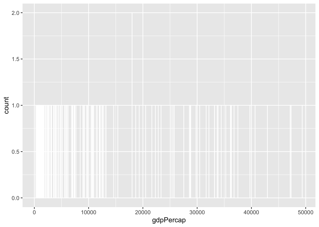 haha yeah that’s delightfully wrong. Each bar here is showing the count of countries with GDP per capita is $10,000–$10,001, then $10,001–$10.002, then $10,002–$10,003, and so on. Basically every country has its own unique GDP per capita, so the count for each of those super narrow bars is 1 (there’s one exception where two countries fall in the same bucket, which is why the y-axis goes up to 2). You can’t actually see any of the bars here because they’re too narrow—all you can really see is the white border around the bars.