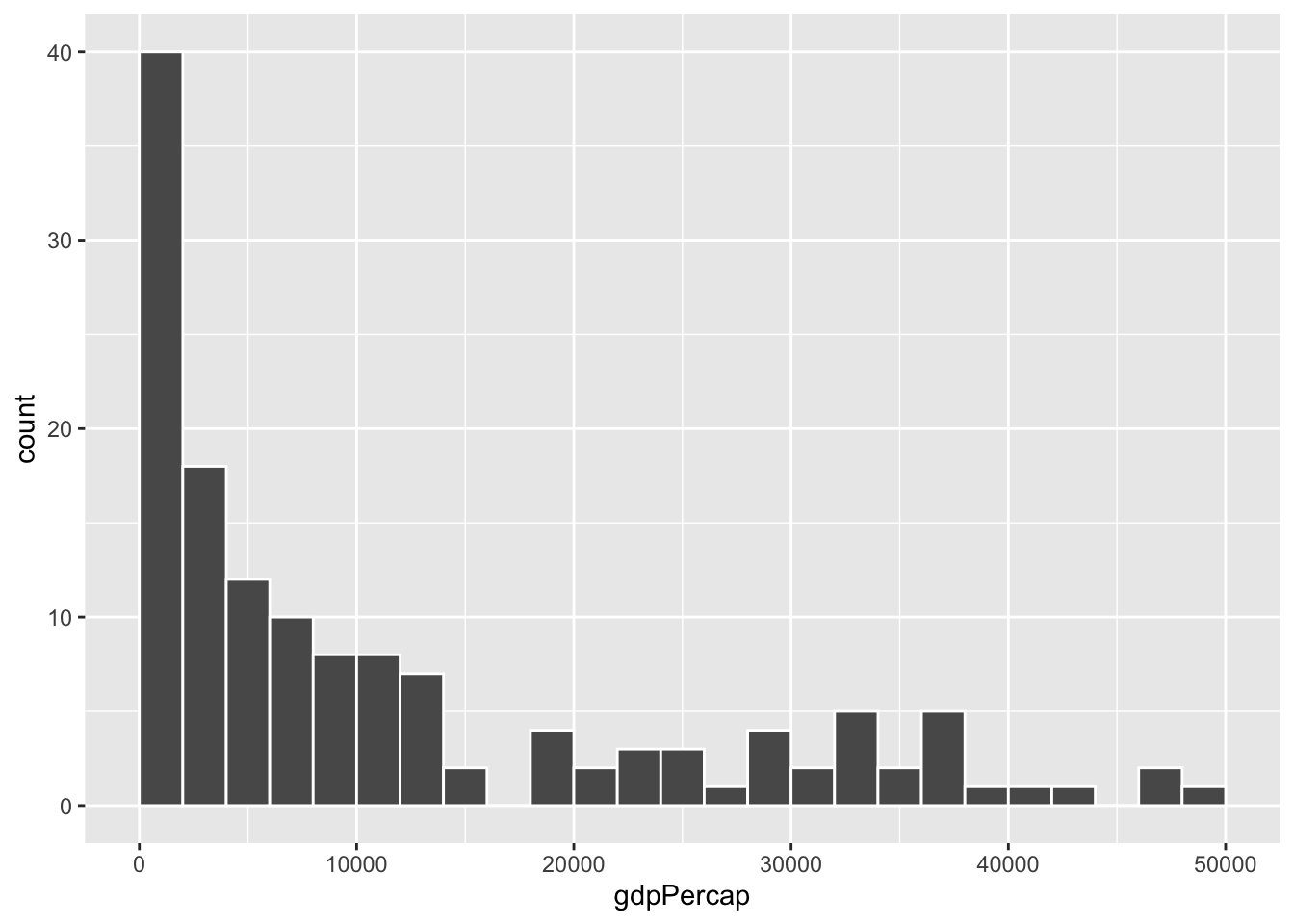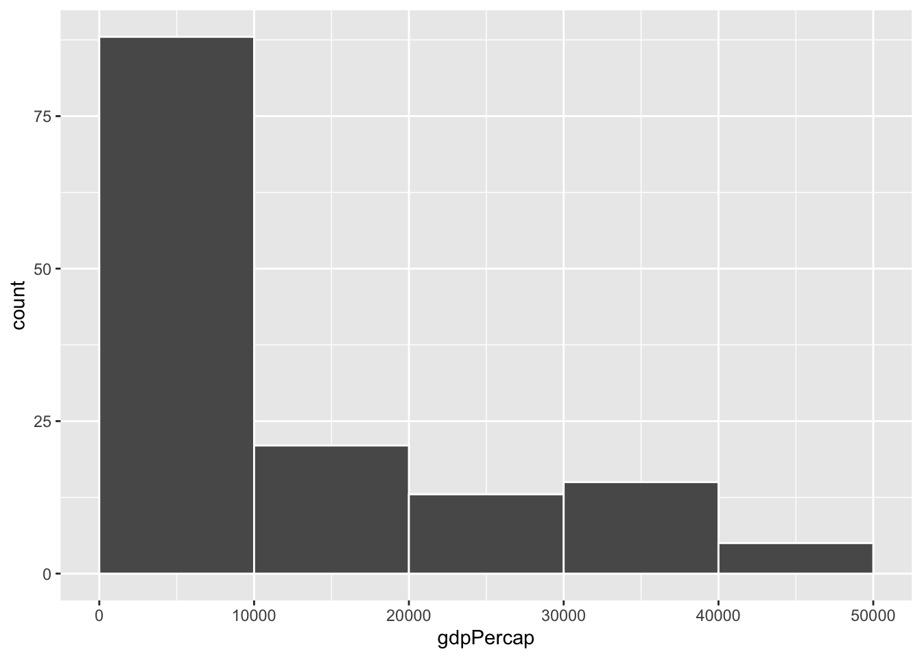 To actually see what’s happening, you need a bigger bin width. How much bigger is up to you. With life expectancy we played around with 1, 5, and 20, but those bucket sizes are waaaay too small for GDP per capita. Try bigger values instead. But again, there’s no right number here!