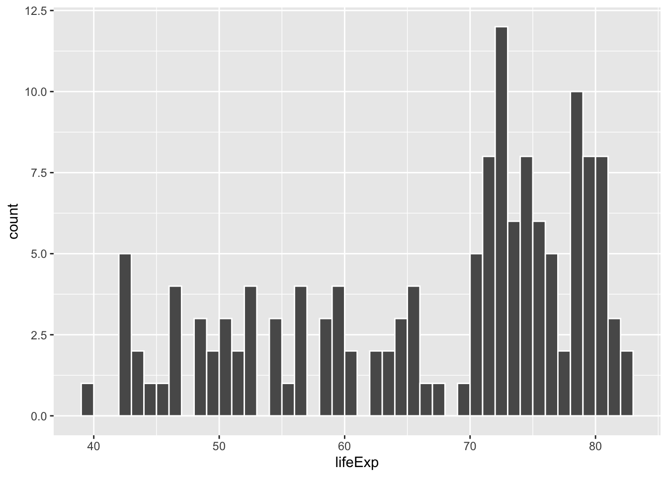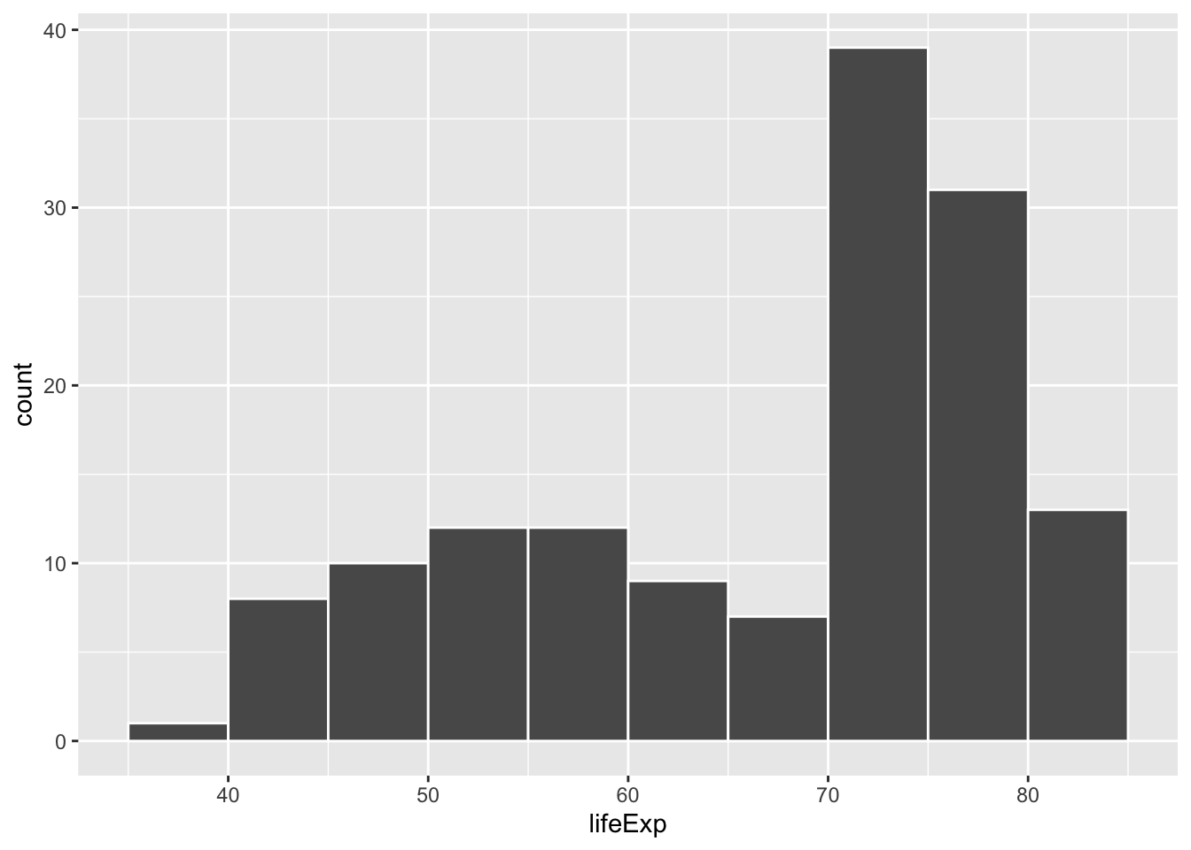 The binwidth = 5 setting means that each of those bars shows the count of countries with life expectancies in five-year buckets: 35–40, 40–45, 45–50, and so on.