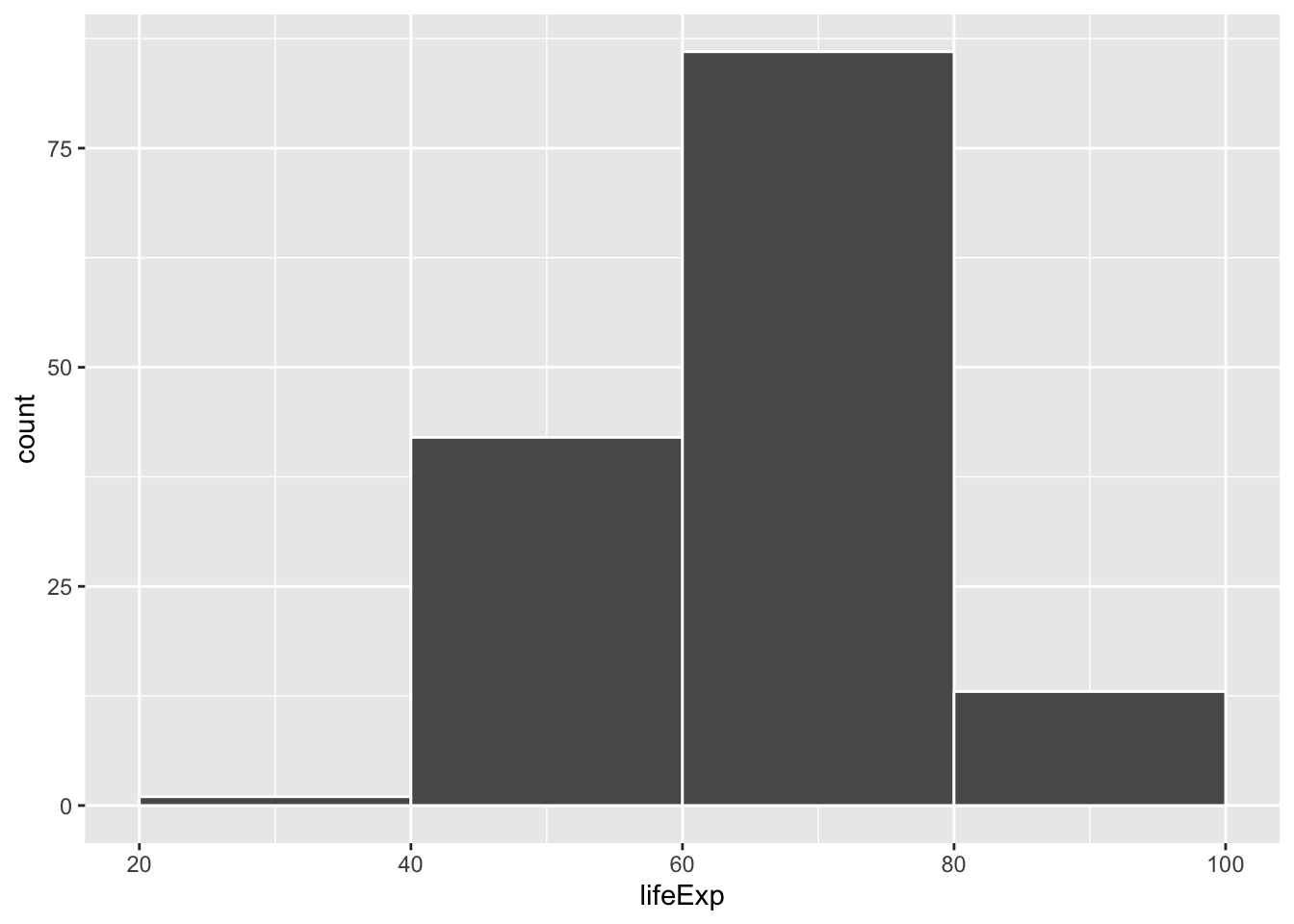 If we change it to binwidth = 20, we get huge bars because the buckets are huge. Now each bar shows the count of countries with life expectancies between 20–40, 40–60, 60–80, and 80–100: