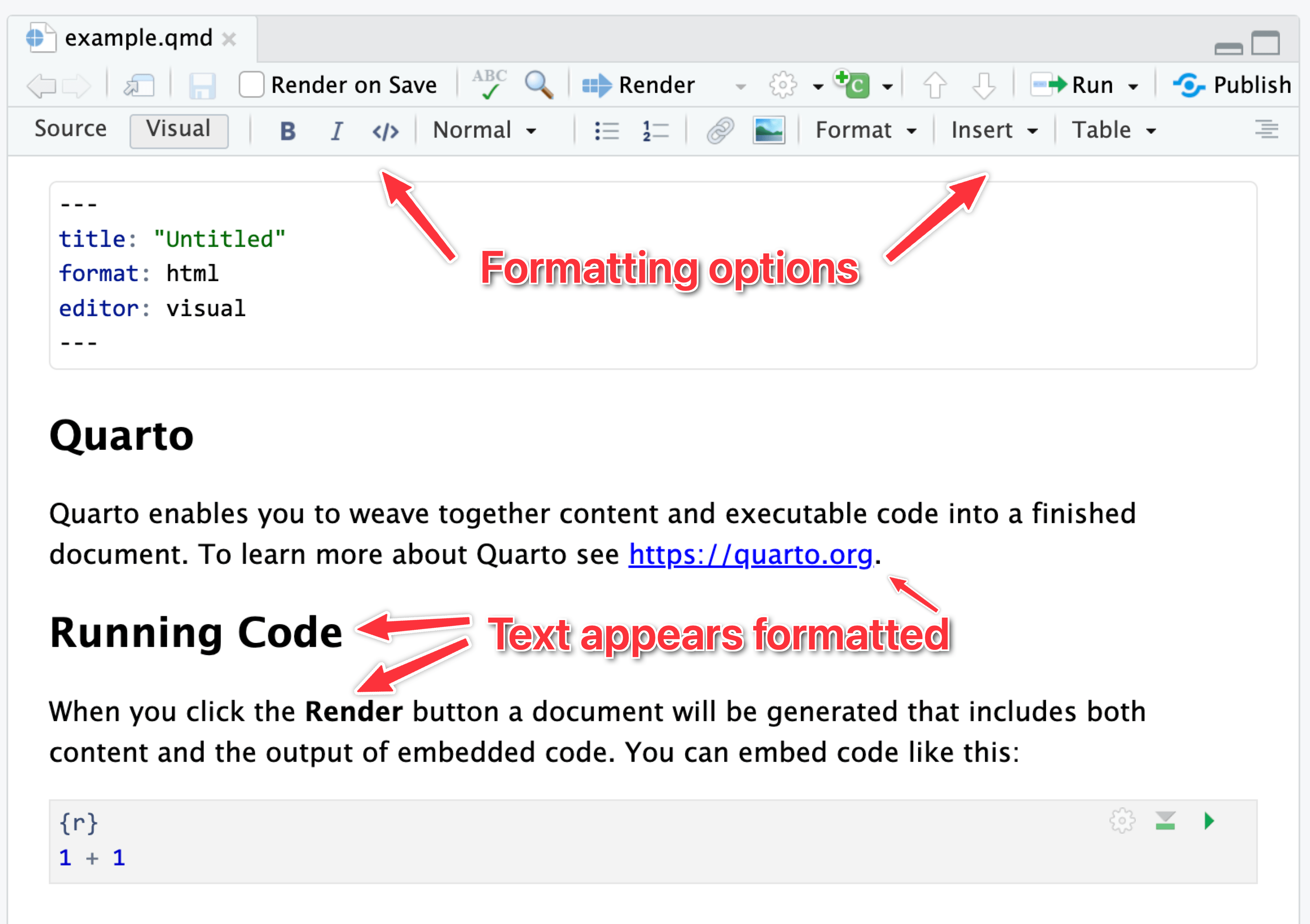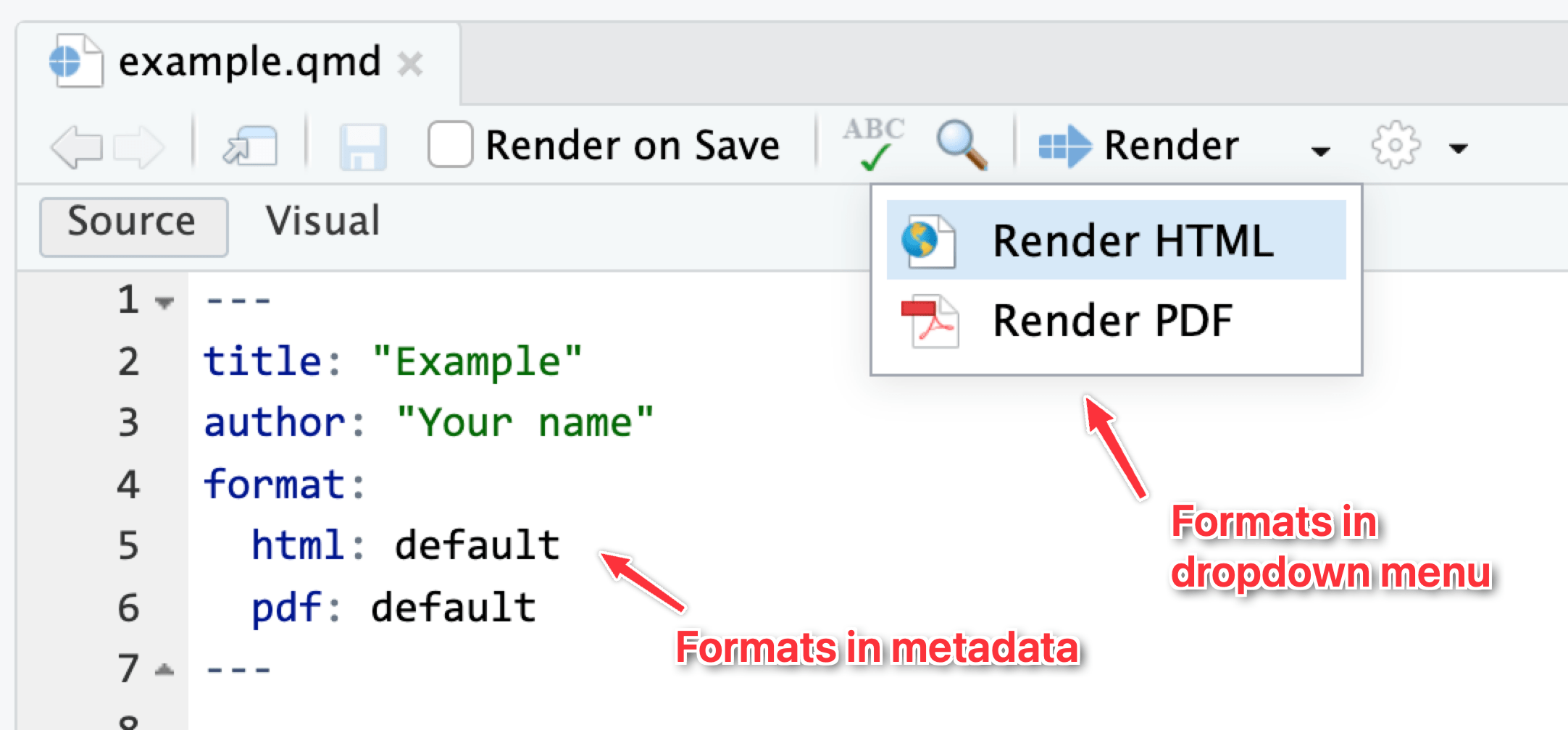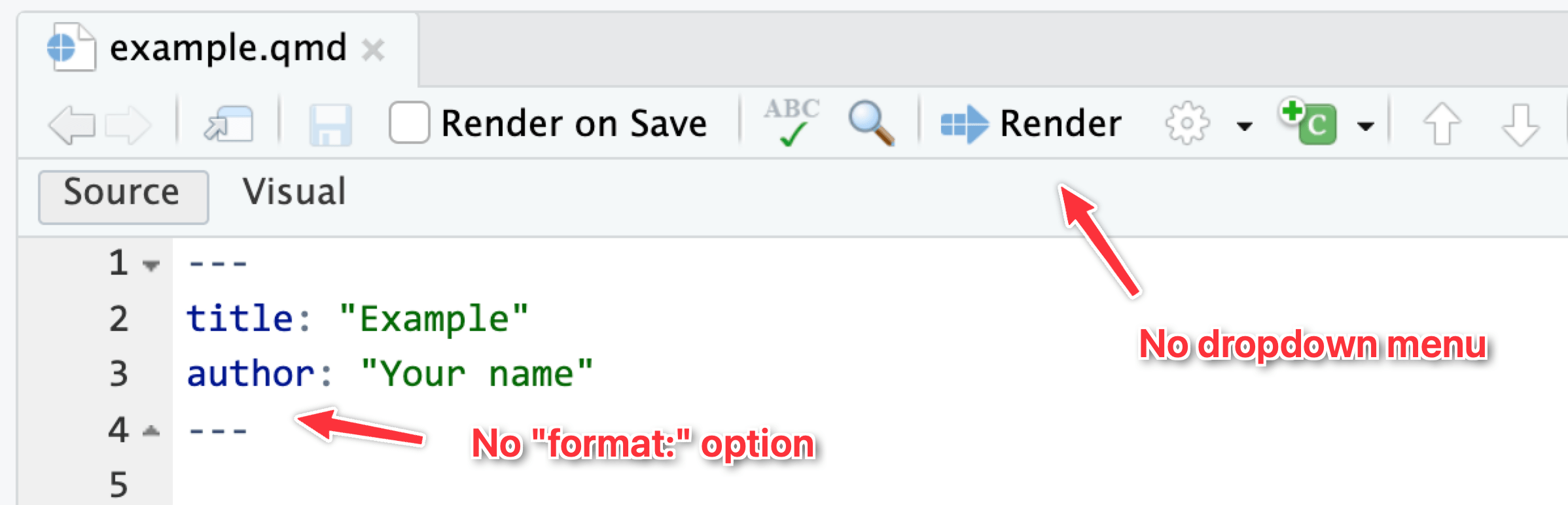 If you don’t specify any format settings in the top part of your document (i.e. the metadata), Quarto documents by default render to HTML. The “Render” button at the top of the editor window won’t have a dropdown menu for switching to other formats—if you click on it, it’ll render to HTML.