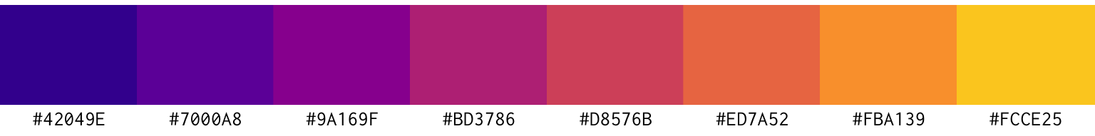 I even do this for this class. Notice that the color scheme in the slides matches the color scheme of the website. It actually comes from the plasma color scale from viridis! I repeat and contrast these same 8 colors throughout the course: