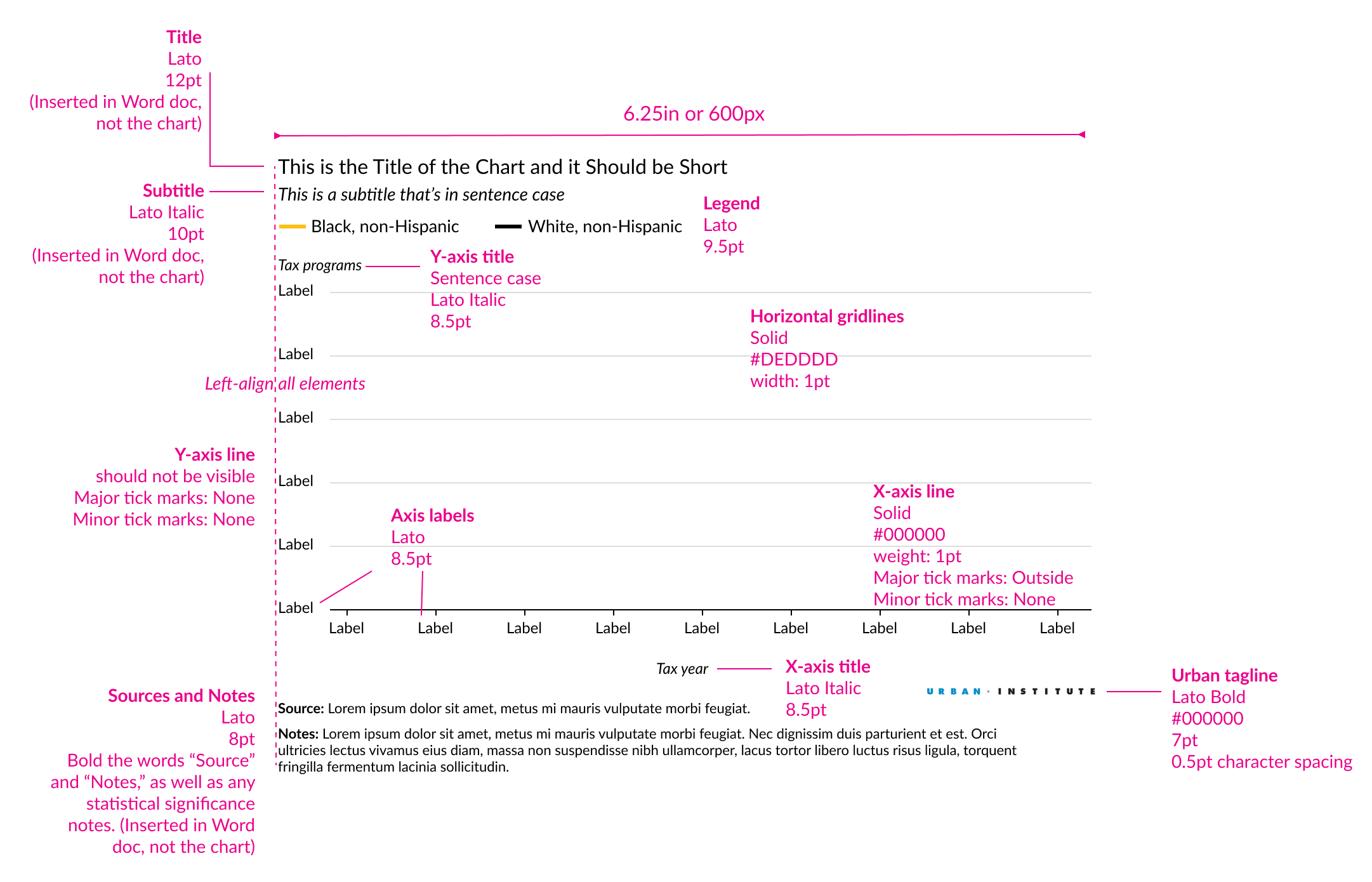 Organizations do this kind of branding on purpose and will have clear visual style guides that they try to use. GSU has specific guidelines for using logos and fonts and colors in ways that follow general graphic design principles. The Urban Institute has the most comprehensive style guide for data visualization specifically that I’ve ever seen. Like, check out their basic graph skeleton (complete with contrast, repetition, alignment, and proximity):