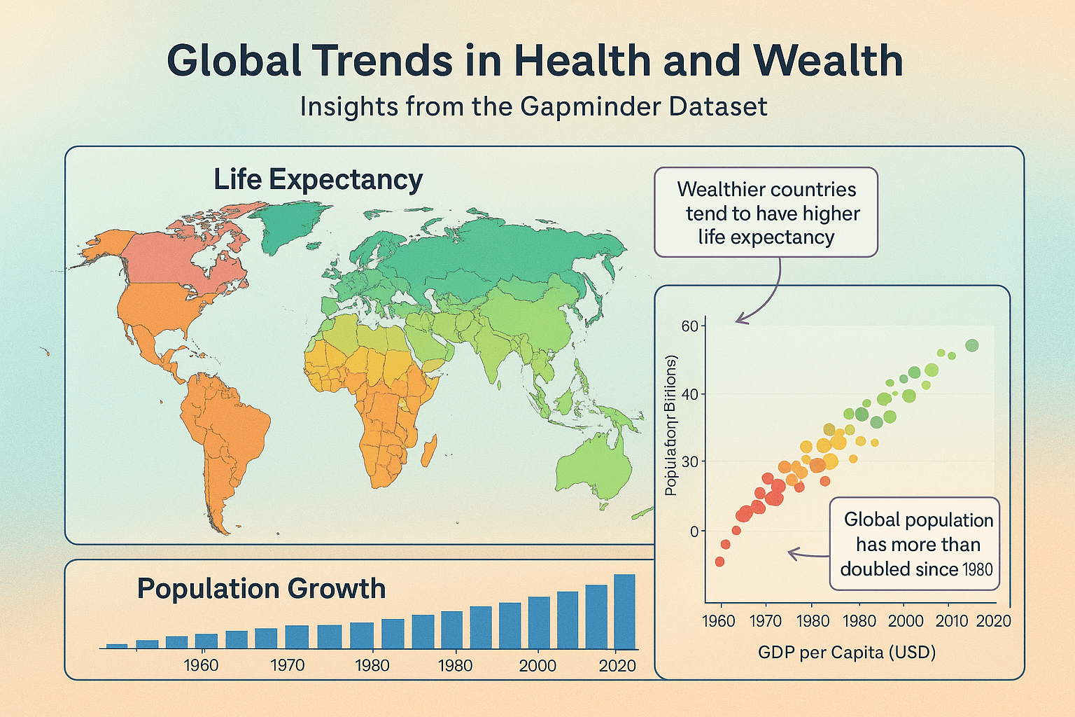 Generate an infographic based on the gapminder dataset from R that has three plot types—a map, a scatterplot, and a bar chart. Give it some sort of title and short description in the subtitle, and a caption and use a good color scheme and make the background of the image fancy with a subtle gradient. Add some arrows and text boxes to annotate interesting things. Make sure each subplot has an informative title.