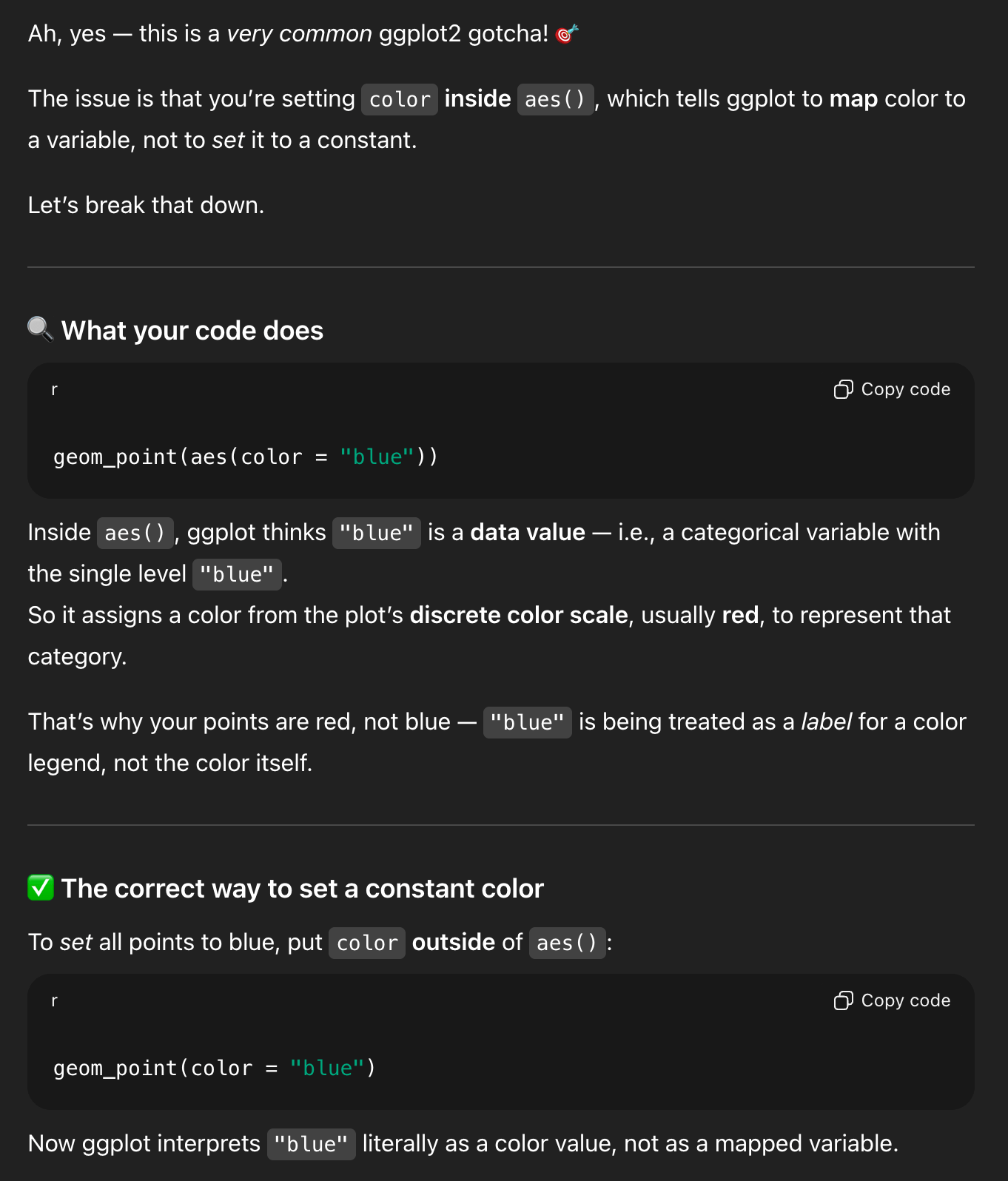 I have a ggplot plot and I want all the points to be blue, but when I used this with geom_point, all the points were red