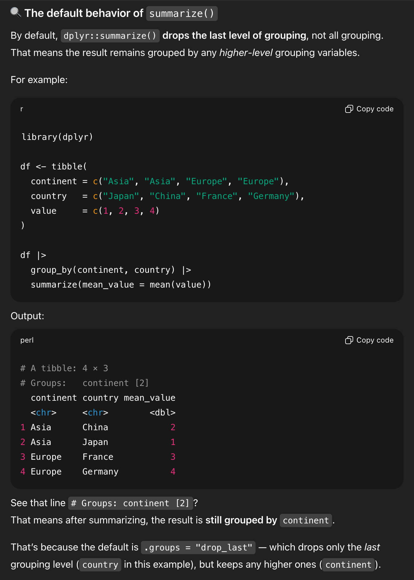 And—here’s the wild part—it concludes by saying that .groups = "drop" isn’t necessary.
