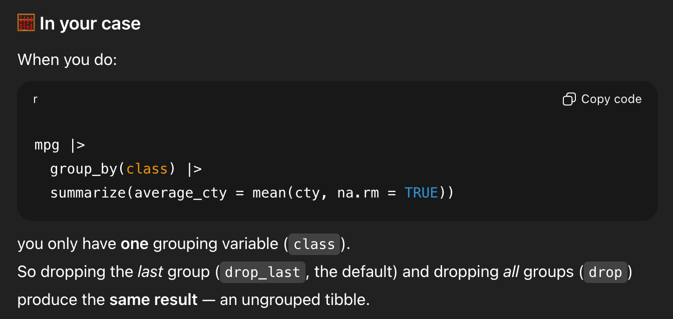 In the middle of generating all that explanation, it forgot that it had started out trying to show me that .groups = "drop" was important, and it ended its explanation by saying that it’s not actually needed.