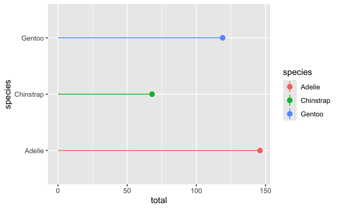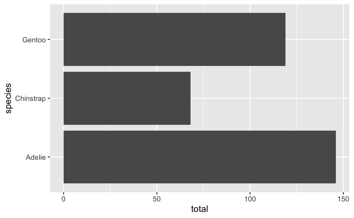 But I do not recommend this. For one thing, we told it to put species on the x-axis and now it’s on the y-axis and now we have to remember that. For another thing, coord_flip() doesn’t flip stuff in the legend.