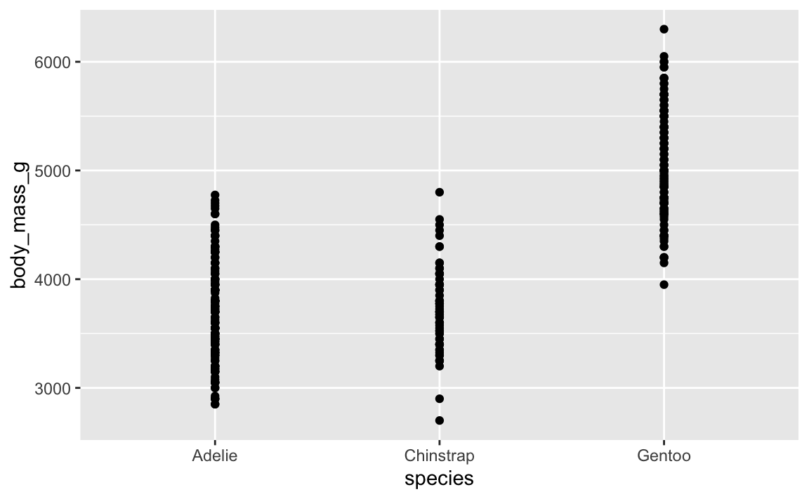 That’s not very helpful since there are so many points still stacked on each other. We can jitter this horizontally, but not vertically. If we jitter vertically, we’ll randomly add/substract body mass from each penguin, which we don’t want to do: