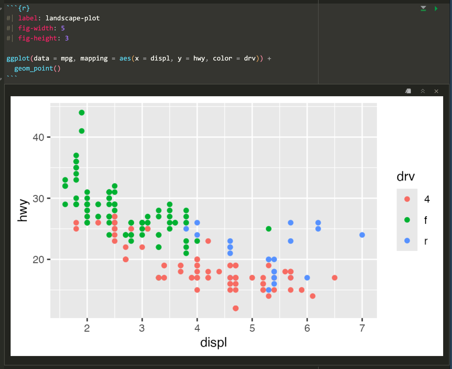 Often, though, those plots are excessively large and can result in text that is too small and dimensions that feel off. You generally want to have better control over the dimensions of the figures you make. For instance, you can make them landscape when there’s lots of text involved. To do this, you can use the fig-width and fig-height chunk options to control the, um, width and height of the figures: