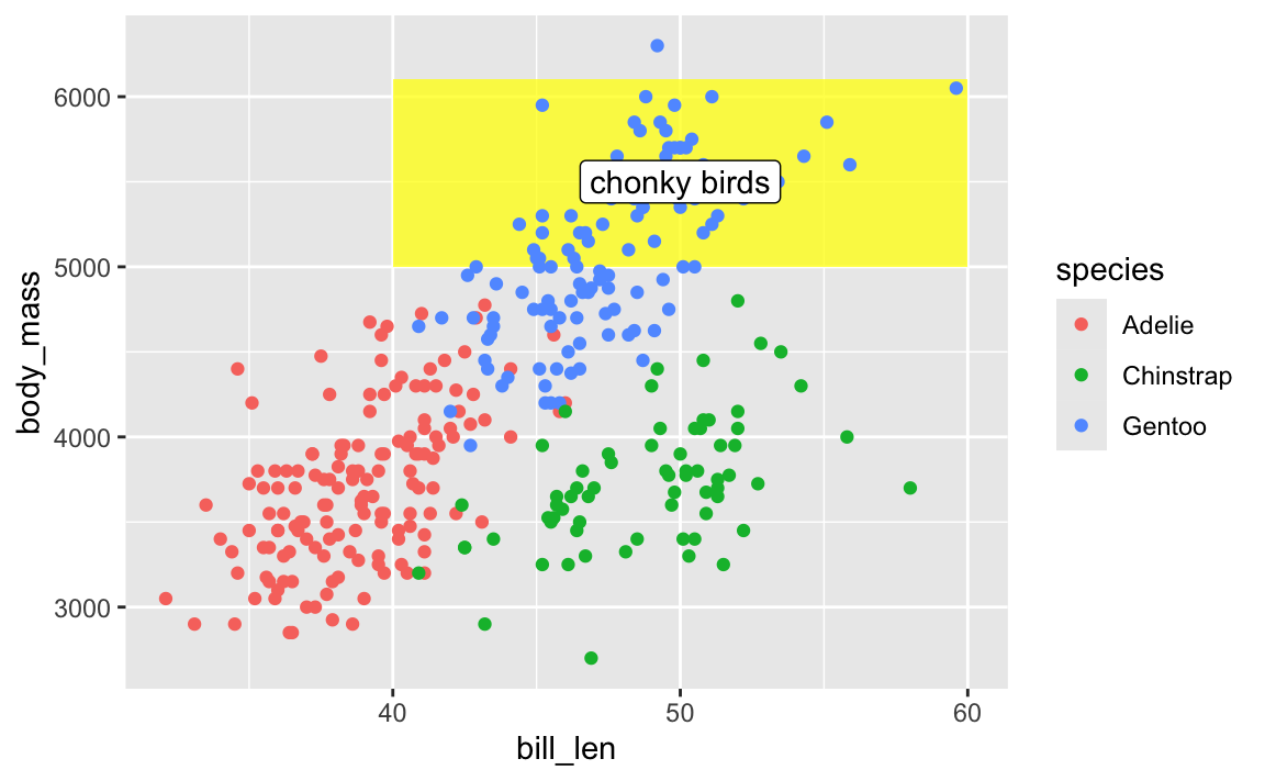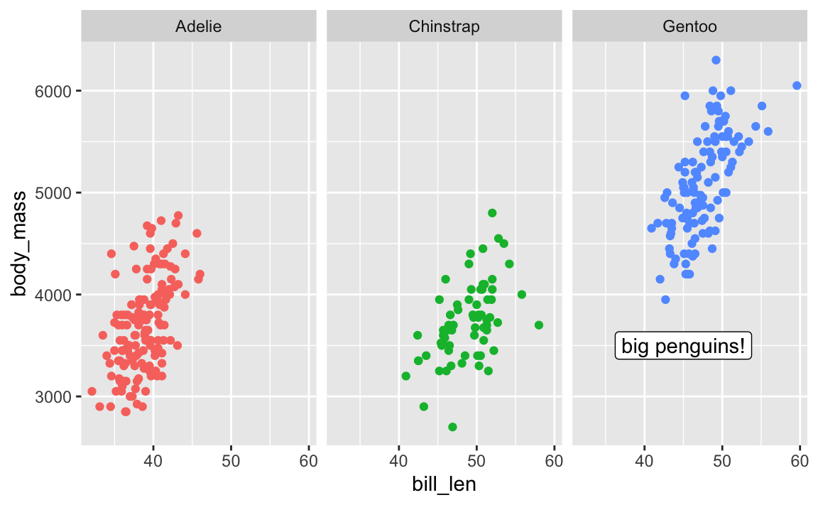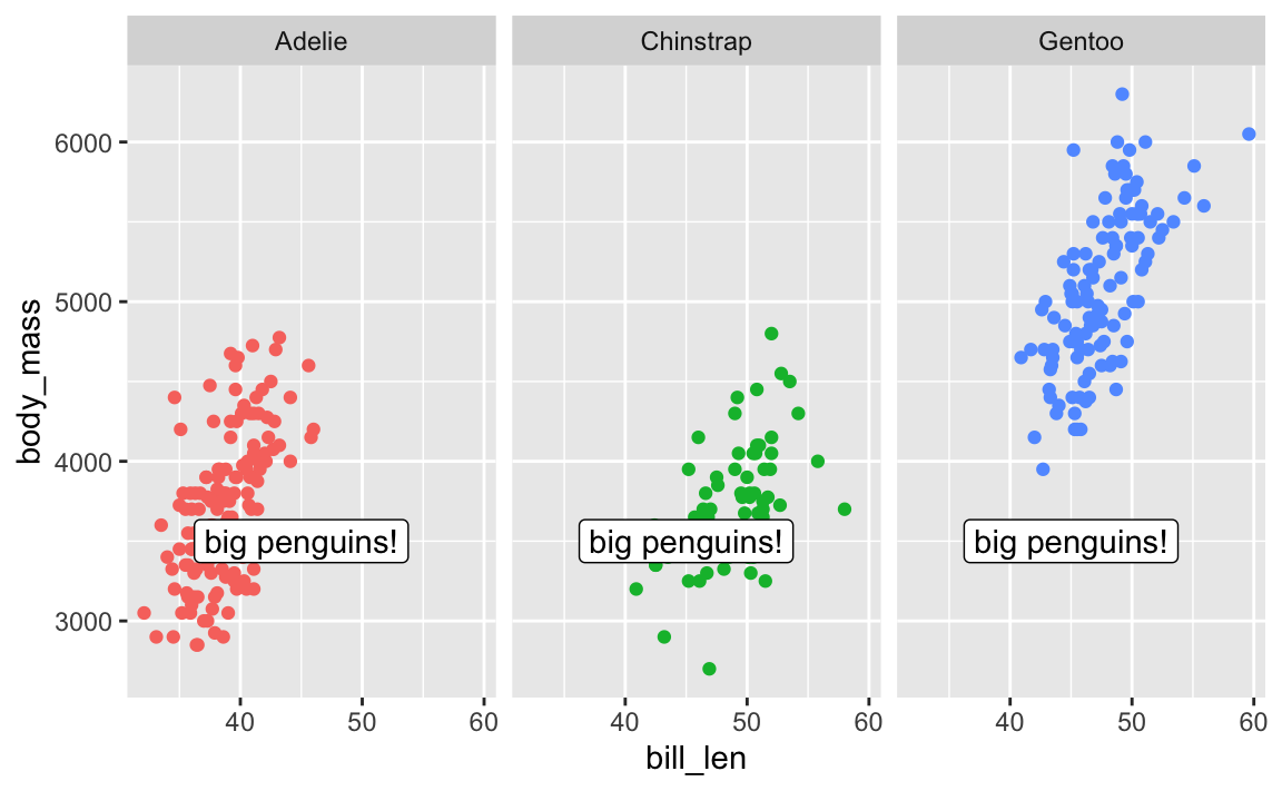 annotate(geom = "label", x = 45, y = 3500, label = "big penguins!"),