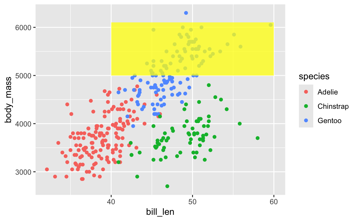 geom_rectgeom_rect() needs xmin, xmax, ymin, and ymax, and it can also do alpha, color (for the border), fill (for the fill), linewidth, and some other things: