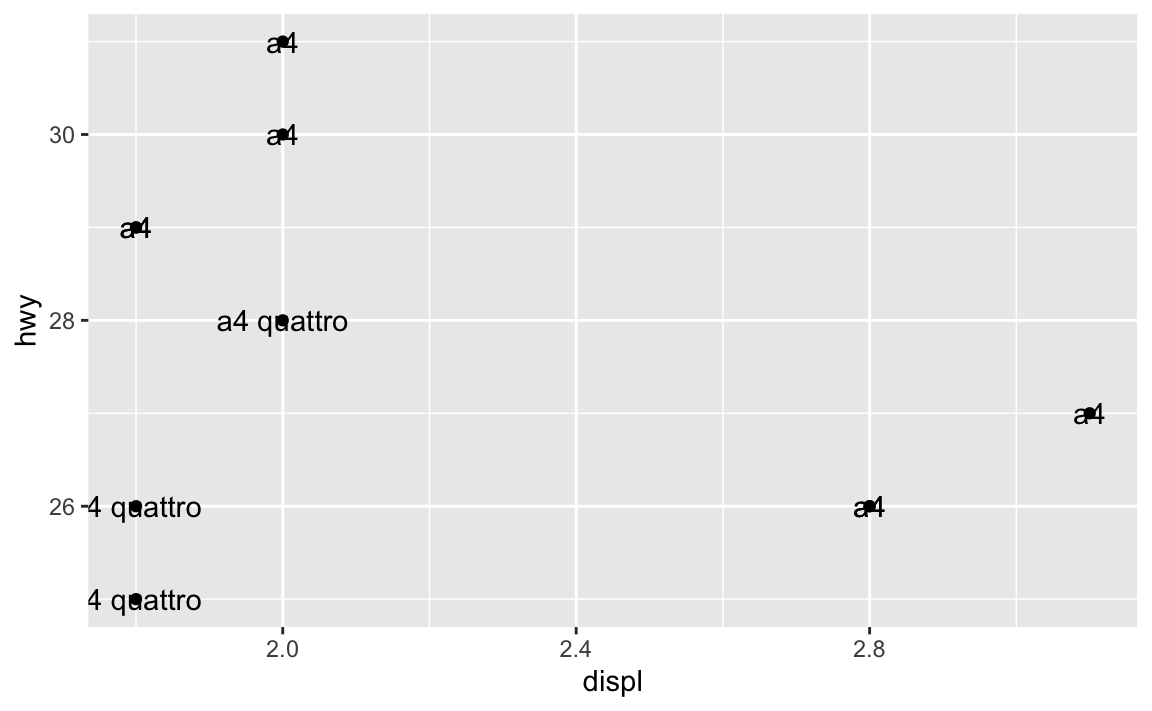 Here we’ve mapped the model column from the dataset to the label aesthetic, so it’s showing the name of the model. You can map any other column too, like label = hwy: