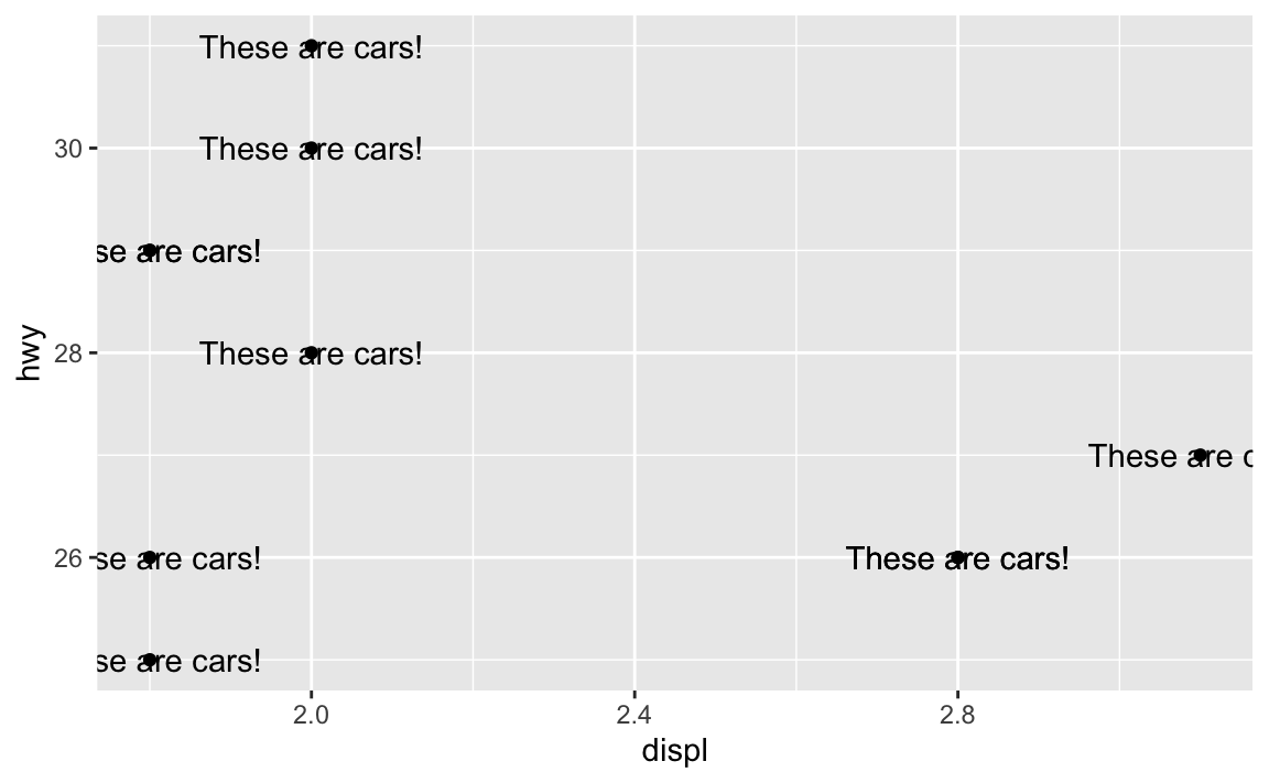 Oops. That’s no what you want! You’re getting the “These are cars!” annotation, but it’s showing up at every single point. That’s because you’re using geom_text()—it adds text for every row in the dataset.