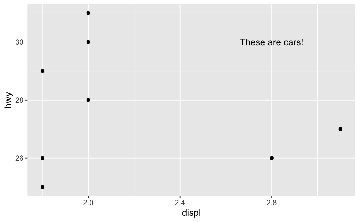 annotate(geom = "text", x = 2.8, y = 30, label = "These are cars!")