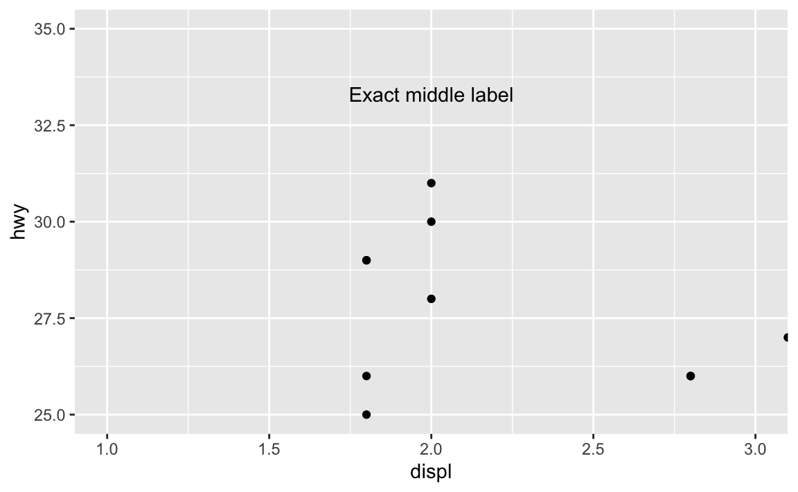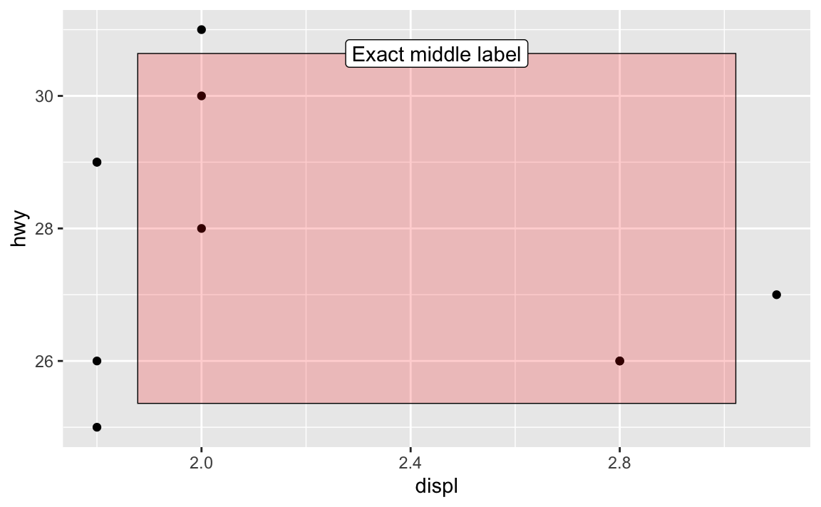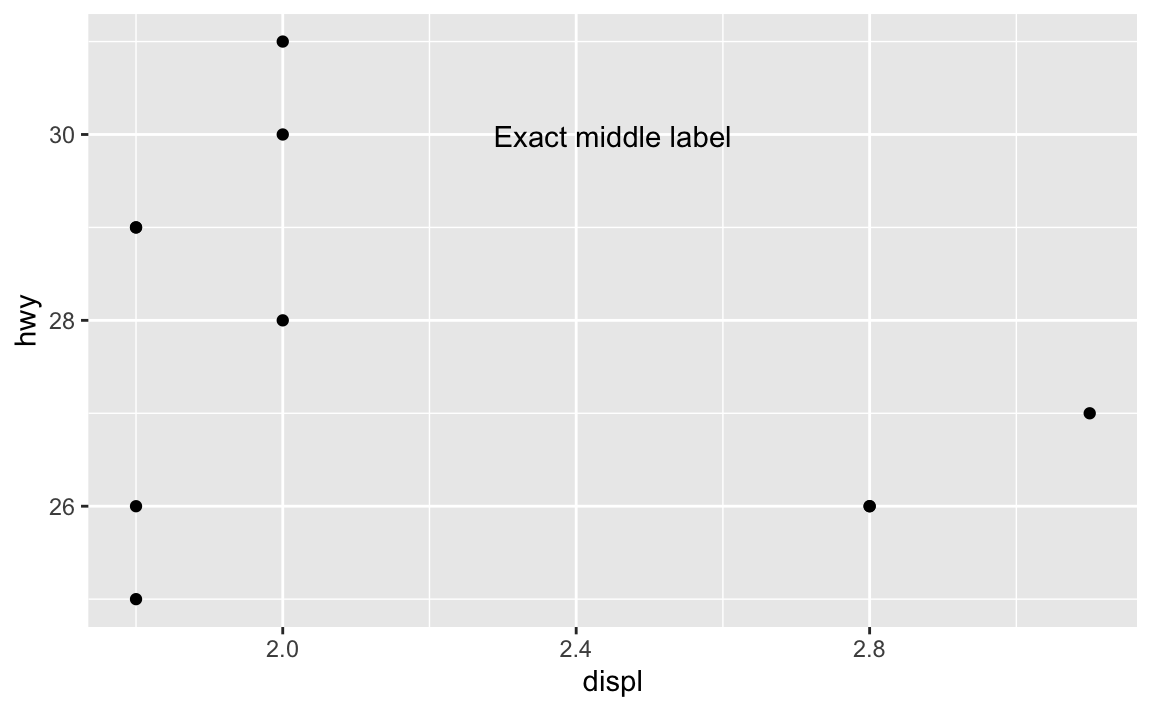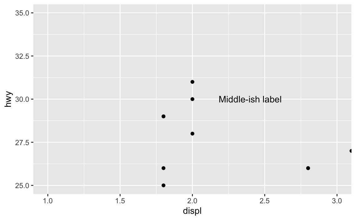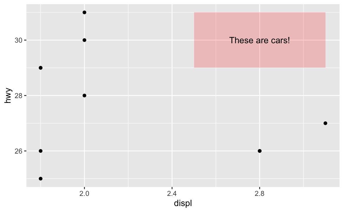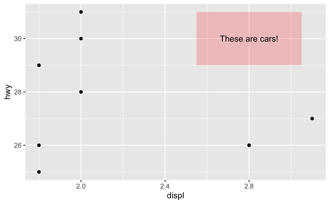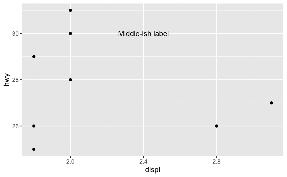 For example, there’s an empty space in this plot in the upper right corner. Let’s put a label at displ = 2.8 and hwy = 30, since there’s no data there: