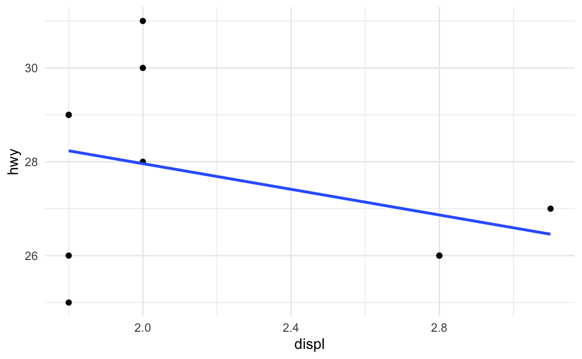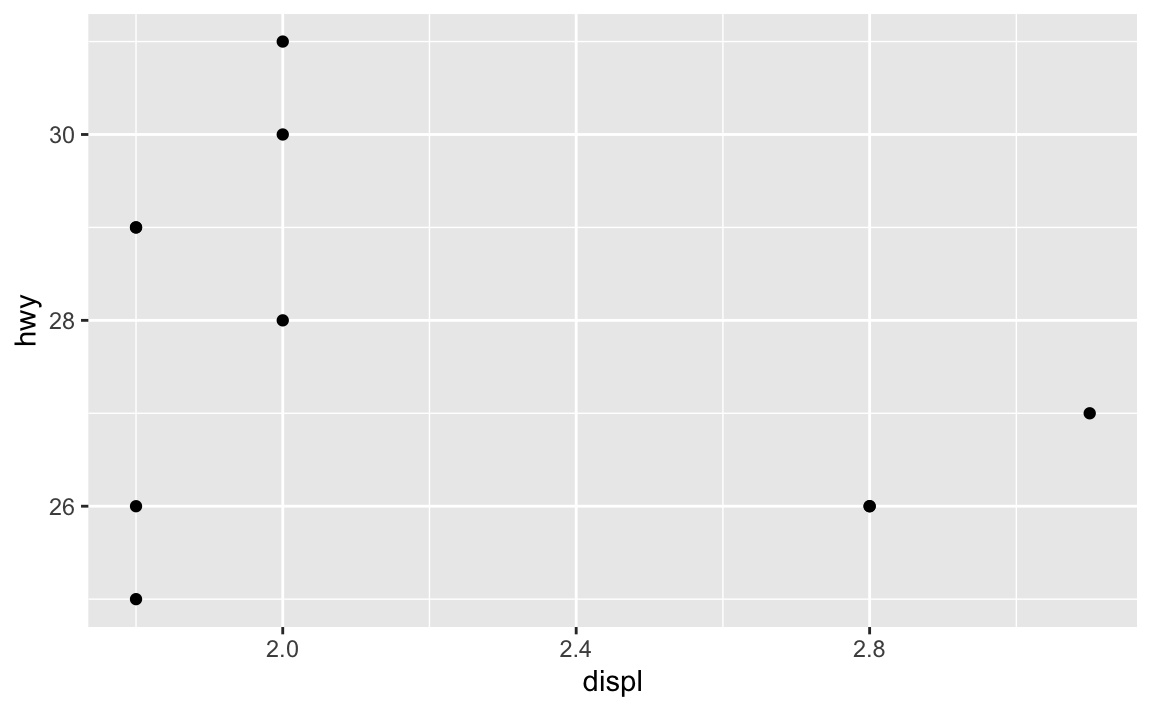 ggplot(mpg_small, aes(x = displ, y = hwy)) +