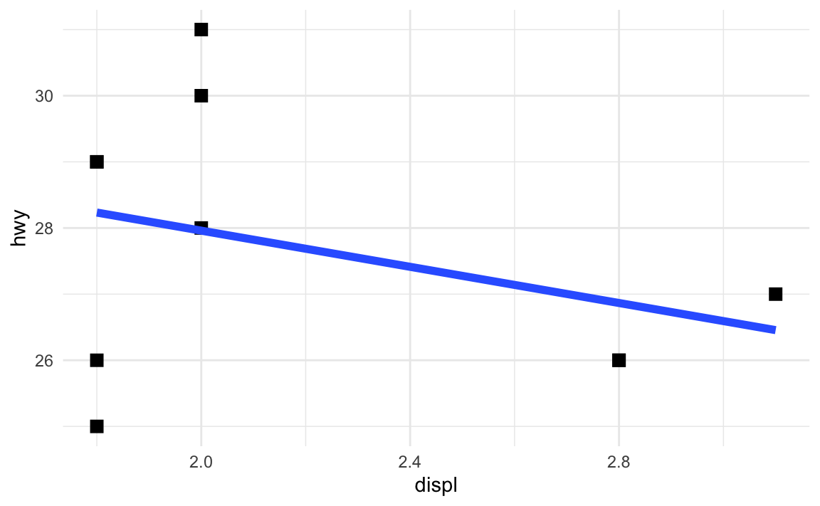 Let’s say I want those points to be a little bigger and be squares, and I want the fitted line to be thicker. I can change those settings in the different geom layers: