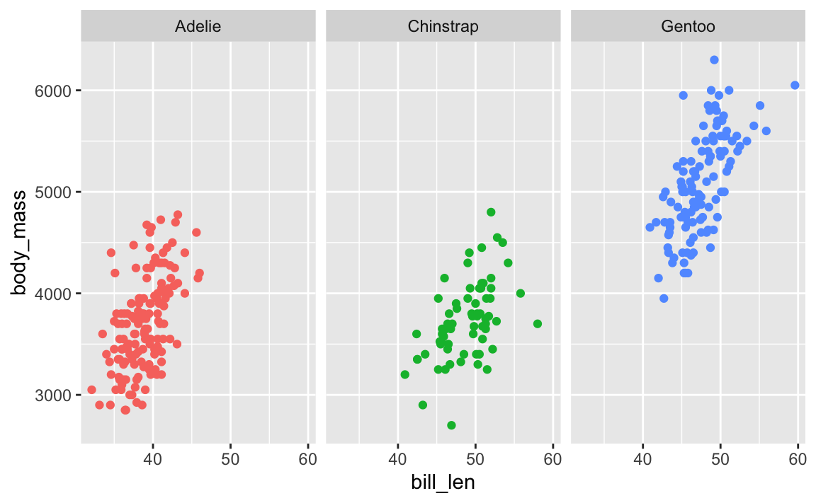 Here’s a little plot of penguin stuff faceted by penguin species: