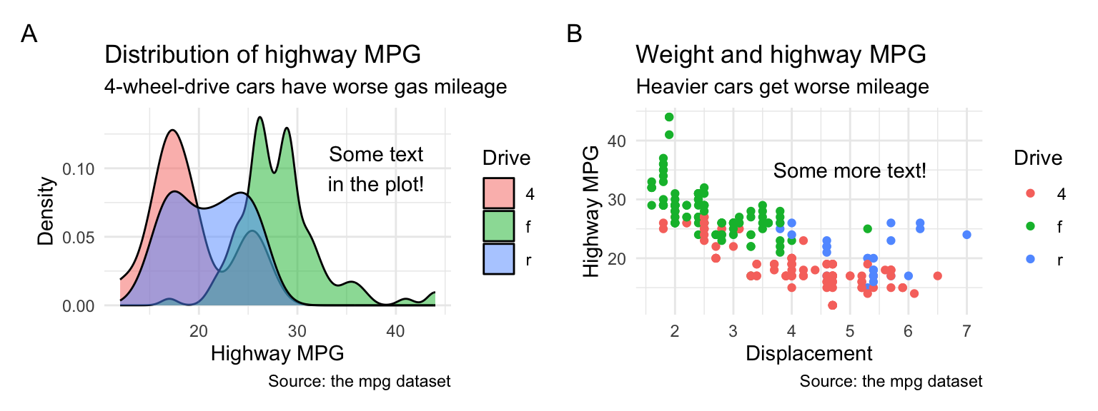 Here’s an example showing both: annotate() adds arbitrary text at specific points in the plots, labs() deals with stuff outside the plot, like the axis labels, titles, and legend names (and this shows tag in action too):