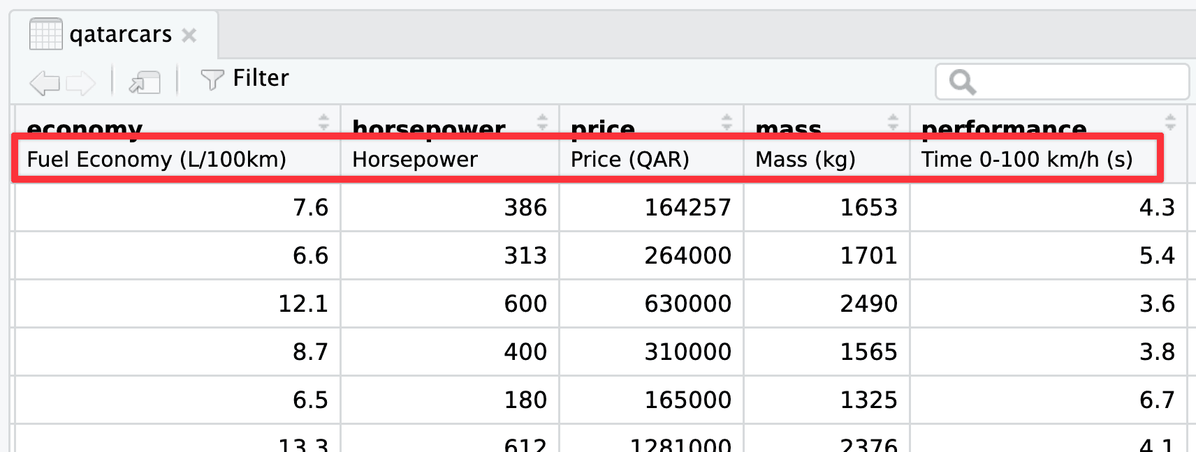 The qatarcars data has column metadata built in already.1 You can also use packages like {haven}, {labelled}, and {sjlabelled} to add labels to columns (see this and this for examples). These column labels will appear in the RStudio data viewer, like this: