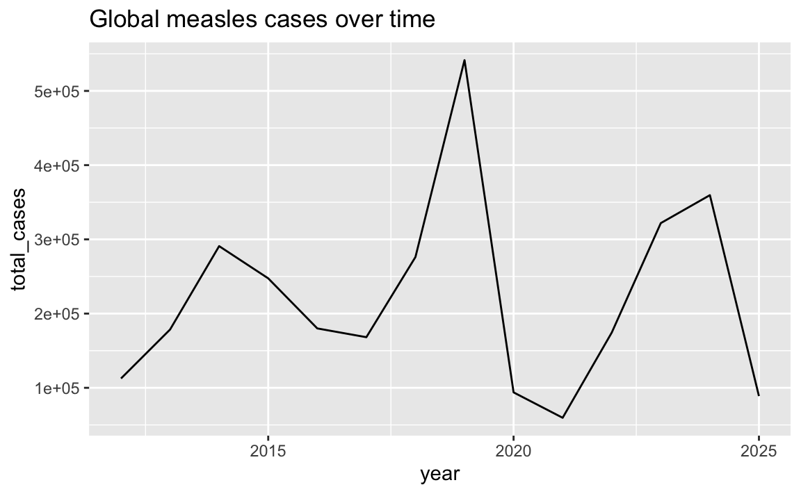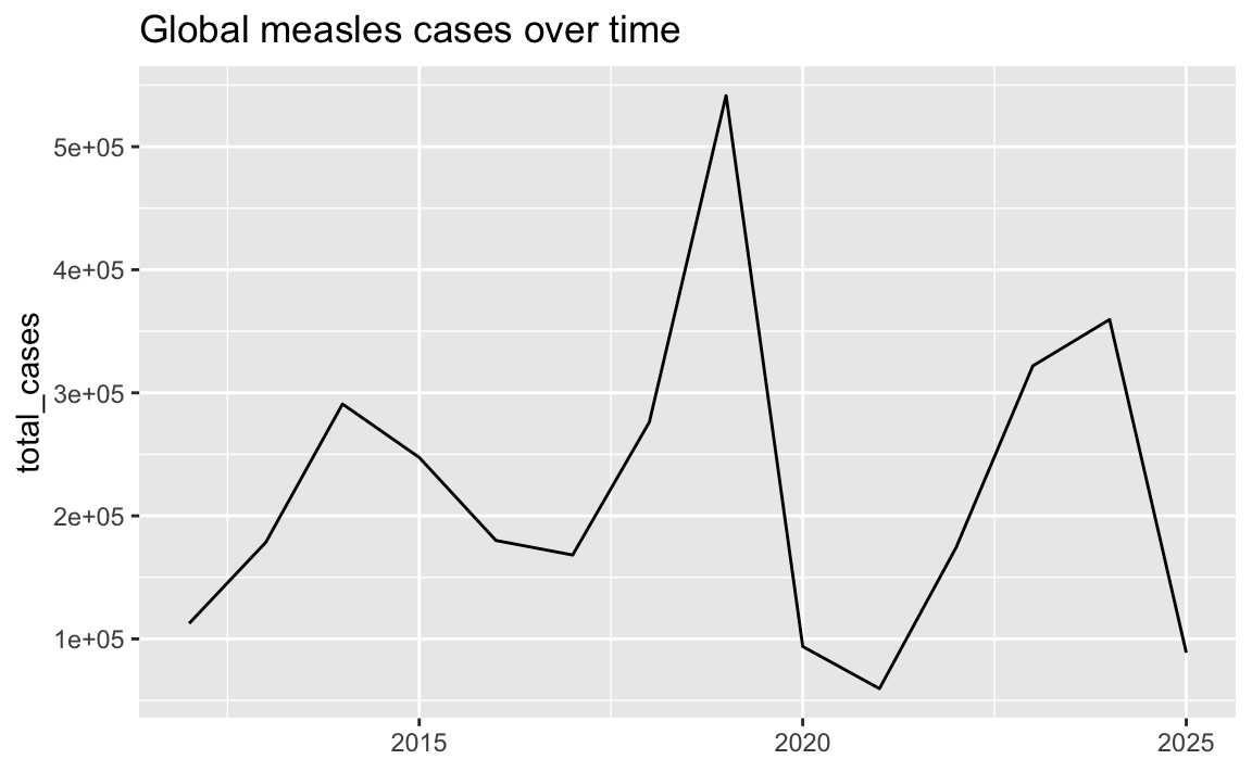 labs(x = NULL, title = "Global measles cases over time")