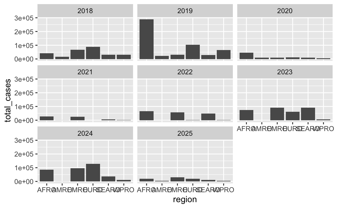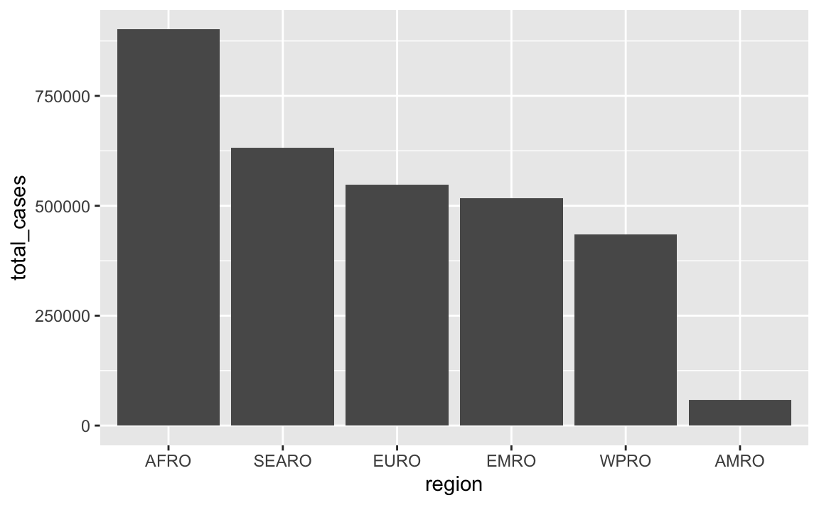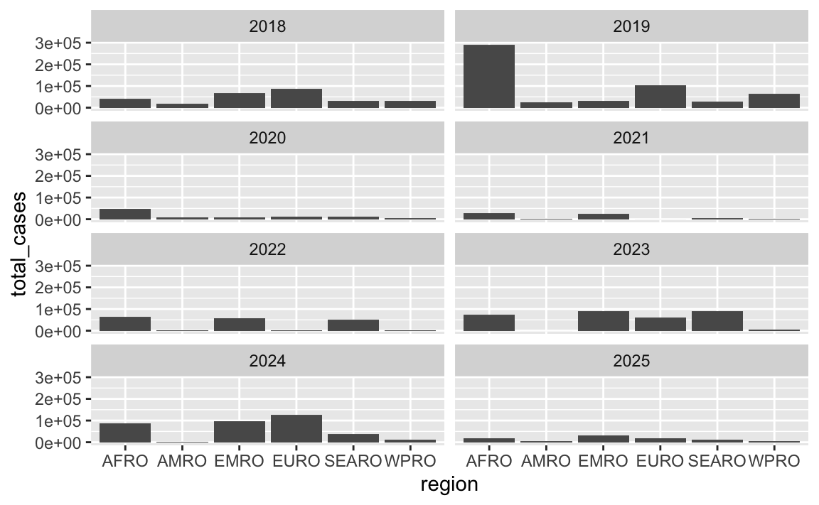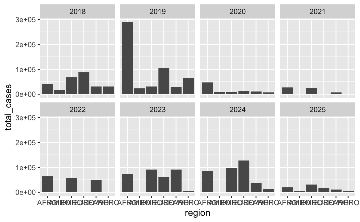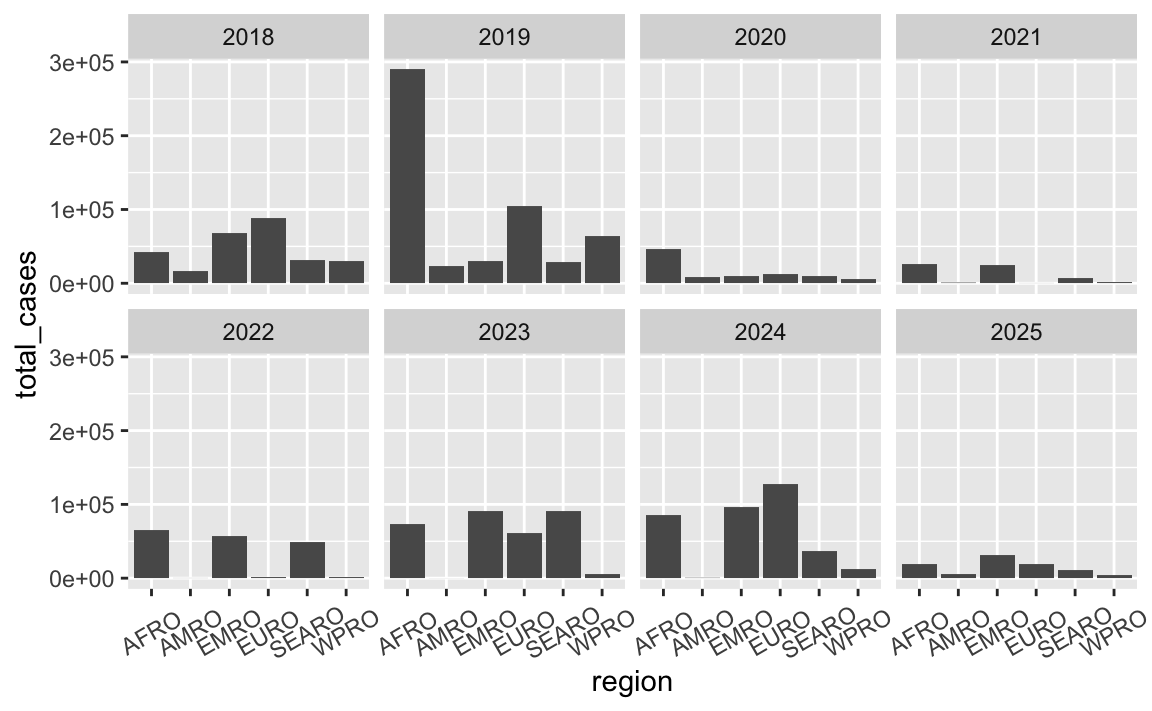 In that plot, the regions on the x-axis are in alphabetic order. If we want to tell a better story, though, it’s helpful to reorder them so that we can more easily see which regions have the most and least measles cases. See here for more about reordering categories. We can sort the data and then use fct_inorder() from the {forcats} package (also one of the nine that gets loaded with library(tidyverse)) to lock these region names in the right order: