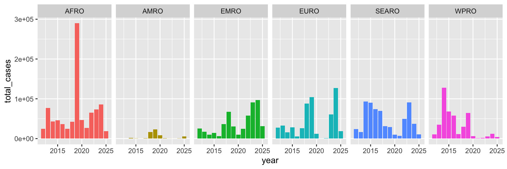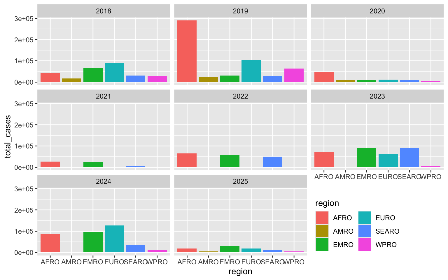 p <- ggplot(cases_by_region_year, aes(x = region, y = total_cases)) +