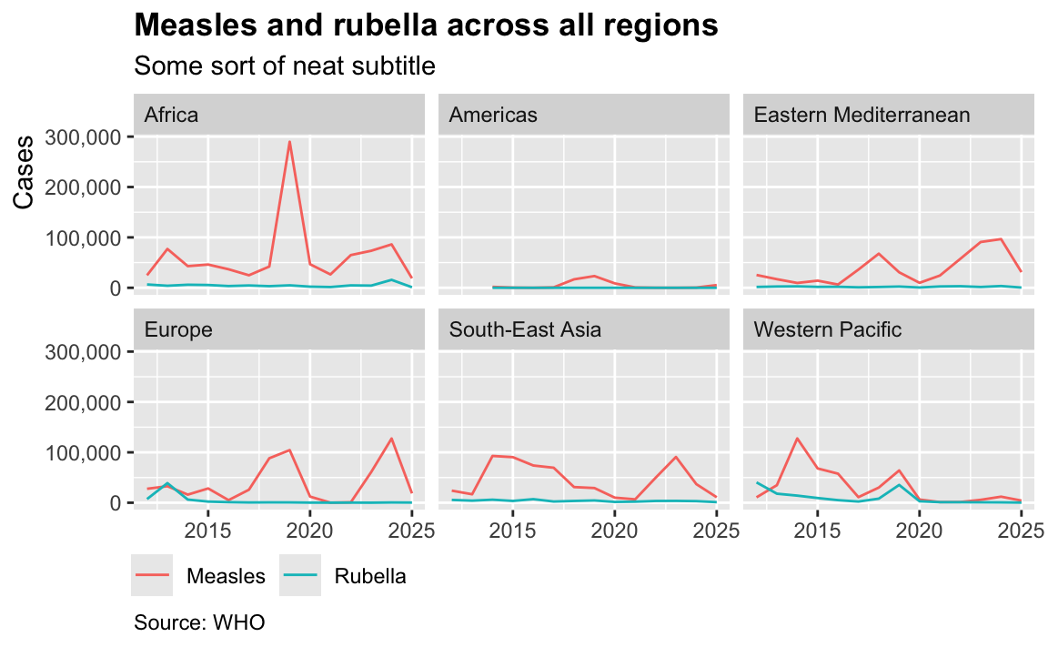 You can often save a ton of space in a plot by removing the legend (when appropriate!). For instance, here we have a plot of cases over time in each region, with lines colored by region: